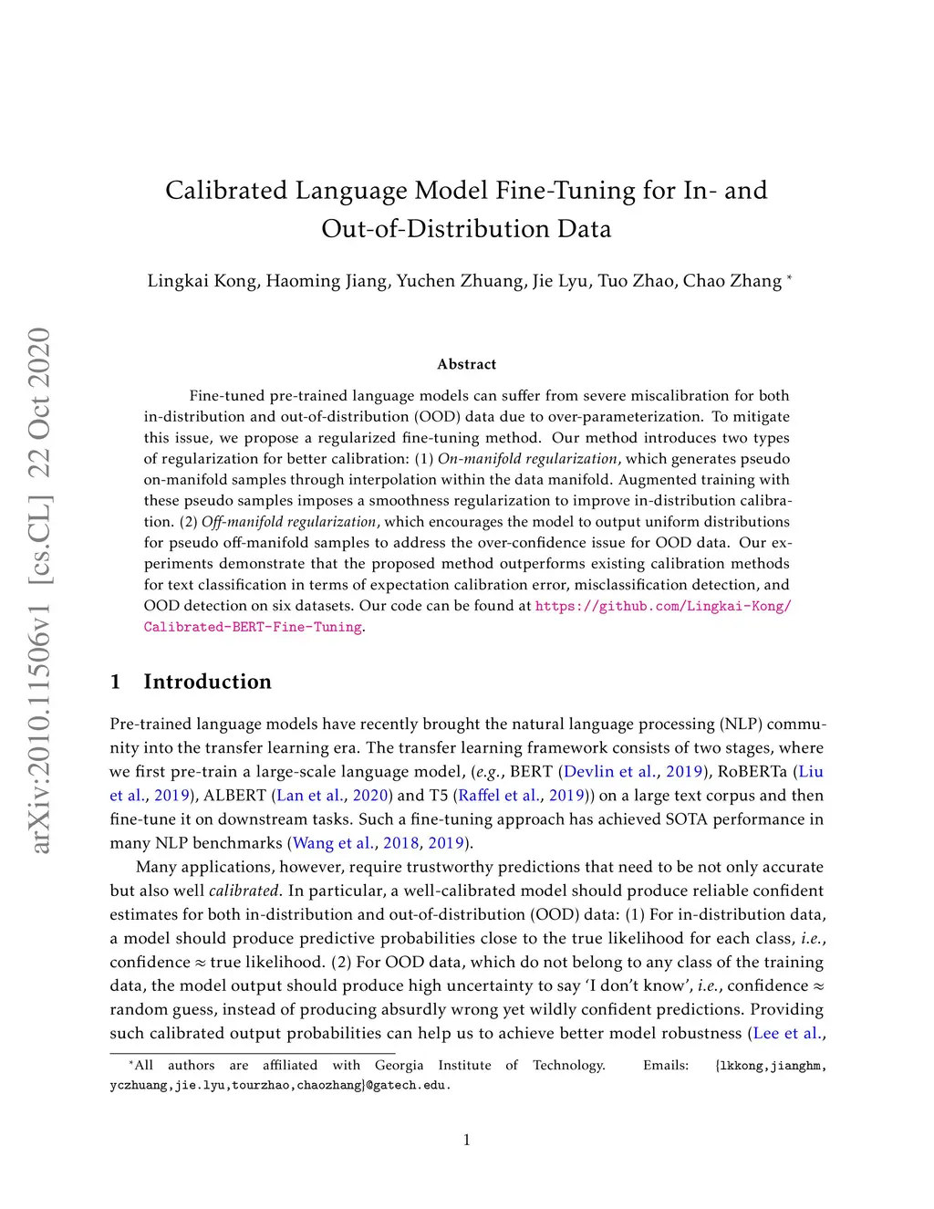 Fine-tuned pre-trained language models can suffer from severe miscalibration for both in-distribution and out-of-distribution (OOD) data due to over-parameterization. To mitigate this issue, we propose a regularized fine-tuning method. Our method introduces two types of regularization for better calibration: (1) On-manifold regularization, which generates pseudo on-manifold samples through interpolation within the data manifold. Augmented training with these pseudo samples imposes a smoothness regularization to improve in-distribution calibration. (2) Off-manifold regularization, which encourages the model to output uniform distributions for pseudo off-manifold samples to address the over-confidence issue for OOD data. Our experiments demonstrate that the proposed method outperforms existing calibration methods for text classification in terms of expectation calibration error, misclassification detection, and OOD detection on six datasets. Our code can be found at https://github.com/Lingkai-Kong/Calibrated-BERT-Fine-Tuning.