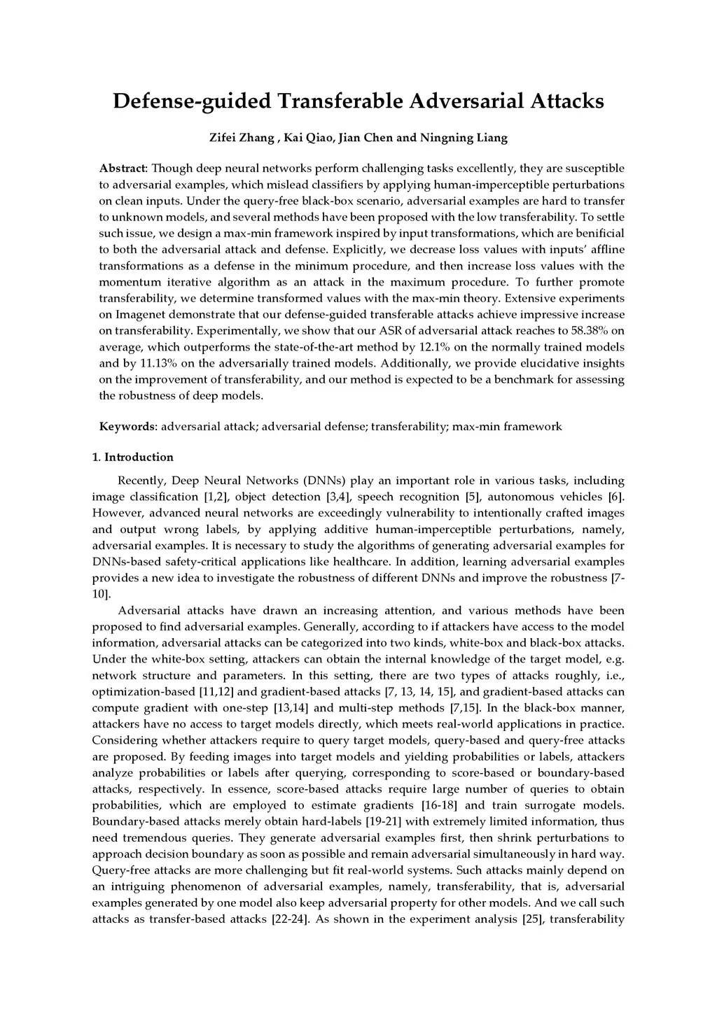 Though deep neural networks perform challenging tasks excellently, they are susceptible to adversarial examples, which mislead classifiers by applying human-imperceptible perturbations on clean inputs. Under the query-free black-box scenario, adversarial examples are hard to transfer to unknown models, and several methods have been proposed with the low transferability. To settle such issue, we design a max-min framework inspired by input transformations, which are benificial to both the adversarial attack and defense. Explicitly, we decrease loss values with inputs' affline transformations as a defense in the minimum procedure, and then increase loss values with the momentum iterative algorithm as an attack in the maximum procedure. To further promote transferability, we determine transformed values with the max-min theory. Extensive experiments on Imagenet demonstrate that our defense-guided transferable attacks achieve impressive increase on transferability. Experimentally, we show that our ASR of adversarial attack reaches to 58.38% on average, which outperforms the state-of-the-art method by 12.1% on the normally trained models and by 11.13% on the adversarially trained models. Additionally, we provide elucidative insights on the improvement of transferability, and our method is expected to be a benchmark for assessing the robustness of deep models.