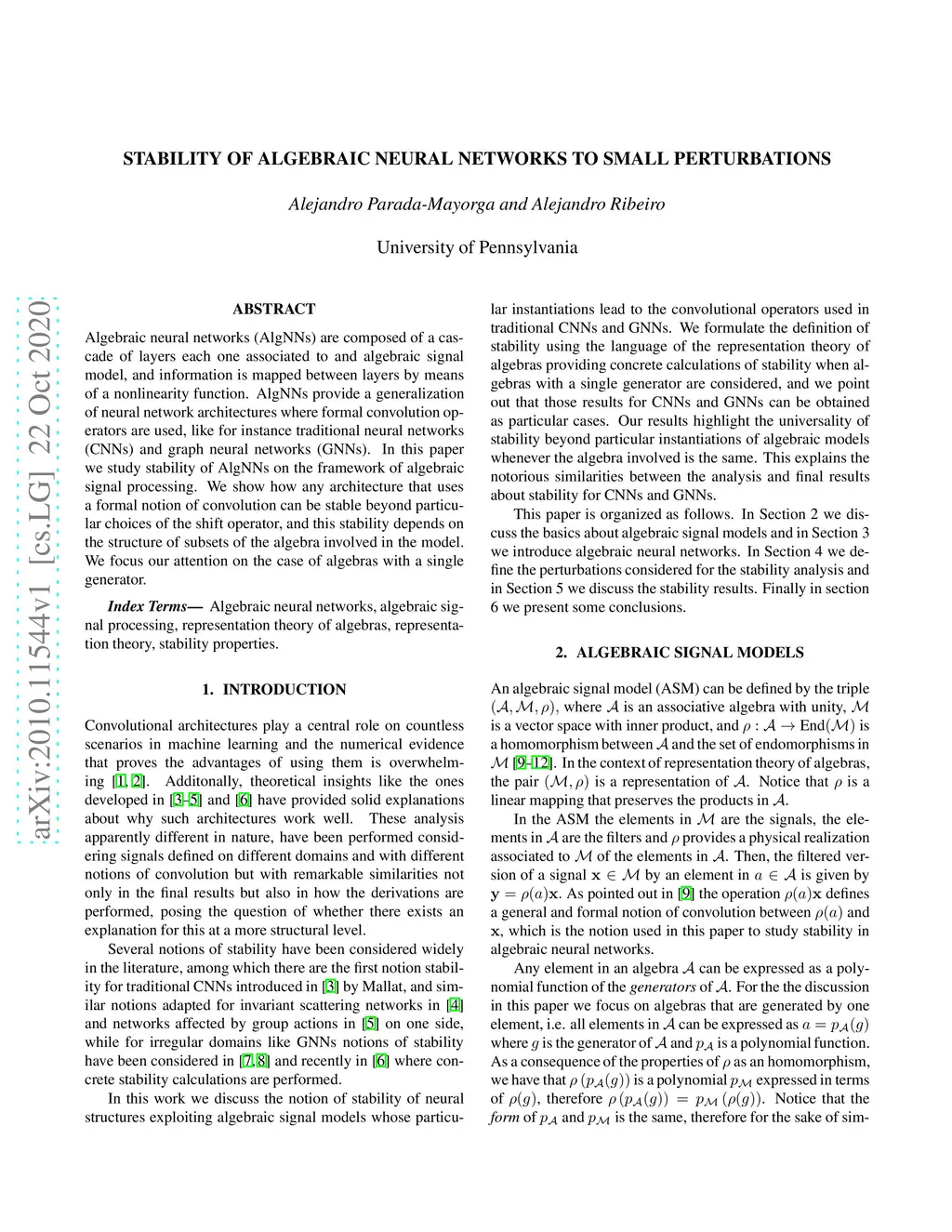 Stability of Algebraic Neural Networks to Small Perturbations