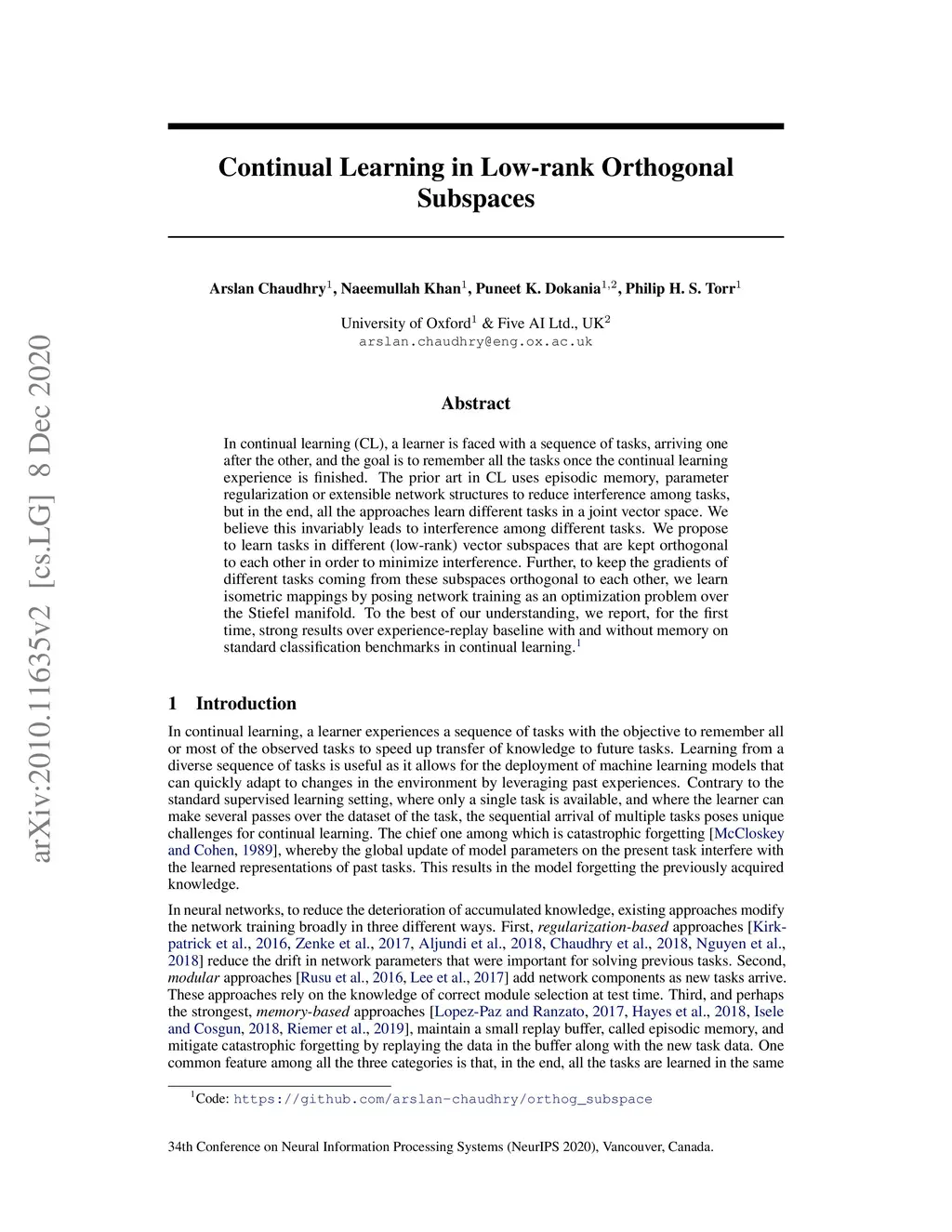 In continual learning (CL), a learner is faced with a sequence of tasks, arriving one after the other, and the goal is to remember all the tasks once the continual learning experience is finished. The prior art in CL uses episodic memory, parameter regularization or extensible network structures to reduce interference among tasks, but in the end, all the approaches learn different tasks in a joint vector space. We believe this invariably leads to interference among different tasks. We propose to learn tasks in different (low-rank) vector subspaces that are kept orthogonal to each other in order to minimize interference. Further, to keep the gradients of different tasks coming from these subspaces orthogonal to each other, we learn isometric mappings by posing network training as an optimization problem over the Stiefel manifold. To the best of our understanding, we report, for the first time, strong results over experience-replay baseline with and without memory on standard classification benchmarks in continual learning. The code is made publicly available.