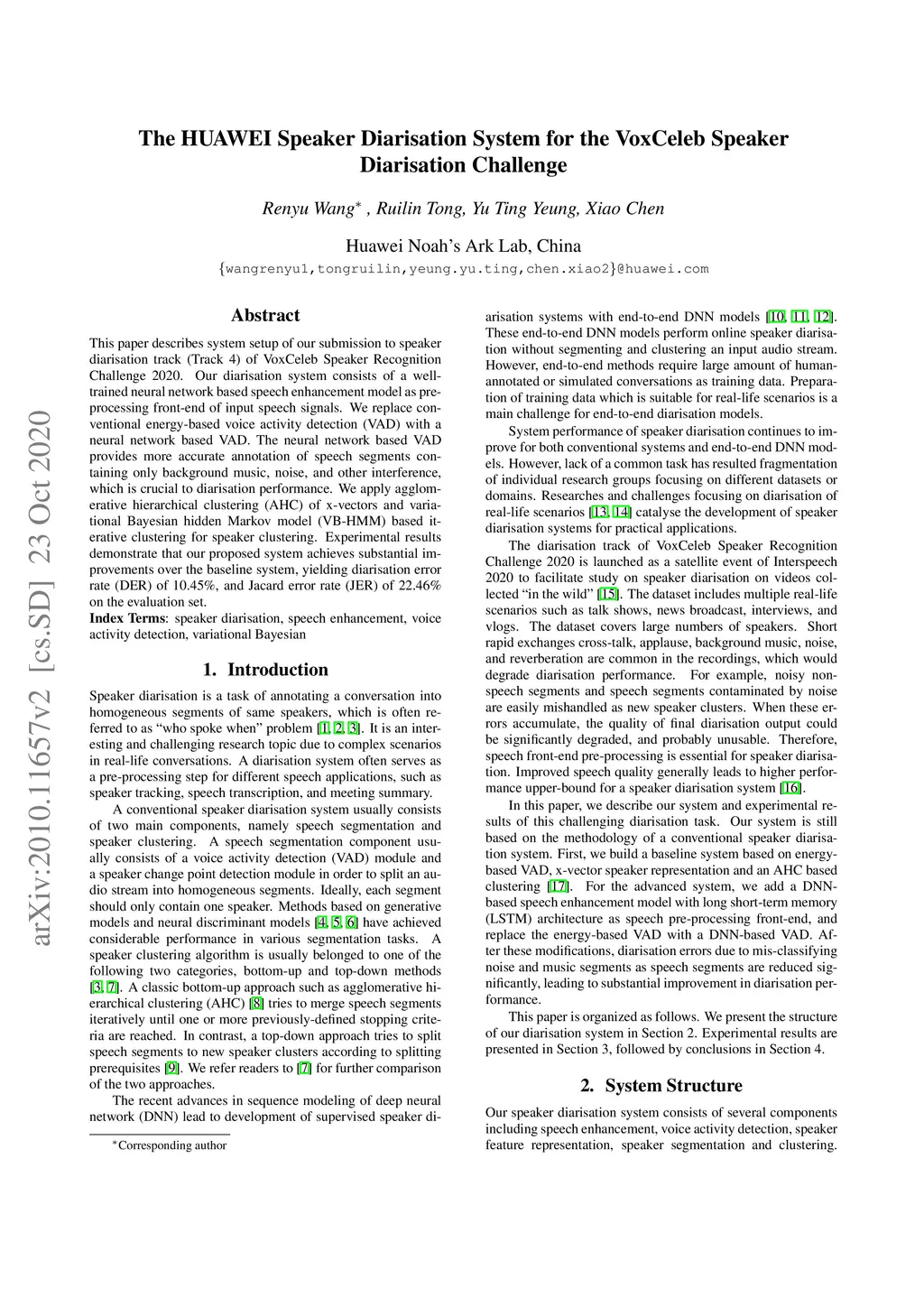 The HUAWEI Speaker Diarisation System for the VoxCeleb Speaker