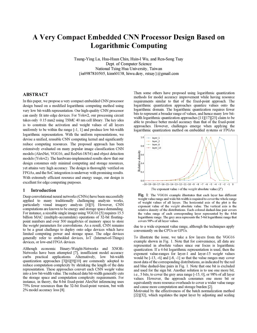 In this paper, we propose a very compact embedded CNN processor design based on a modified logarithmic computing method using very low bit-width representation. Our high-quality CNN processor can easily fit into edge devices. For Yolov2, our processing circuit takes only 0.15 mm2 using TSMC 40 nm cell library. The key idea is to constrain the activation and weight values of all layers uniformly to be within the range [-1, 1] and produce low bit-width logarithmic representation. With the uniform representations, we devise a unified, reusable CNN computing kernel and significantly reduce computing resources. The proposed approach has been extensively evaluated on many popular image classification CNN models (AlexNet, VGG16, and ResNet-18/34) and object detection models (Yolov2). The hardware-implemented results show that our design consumes only minimal computing and storage resources, yet attains very high accuracy. The design is thoroughly verified on FPGAs, and the SoC integration is underway with promising results. With extremely efficient resource and energy usage, our design is excellent for edge computing purposes.