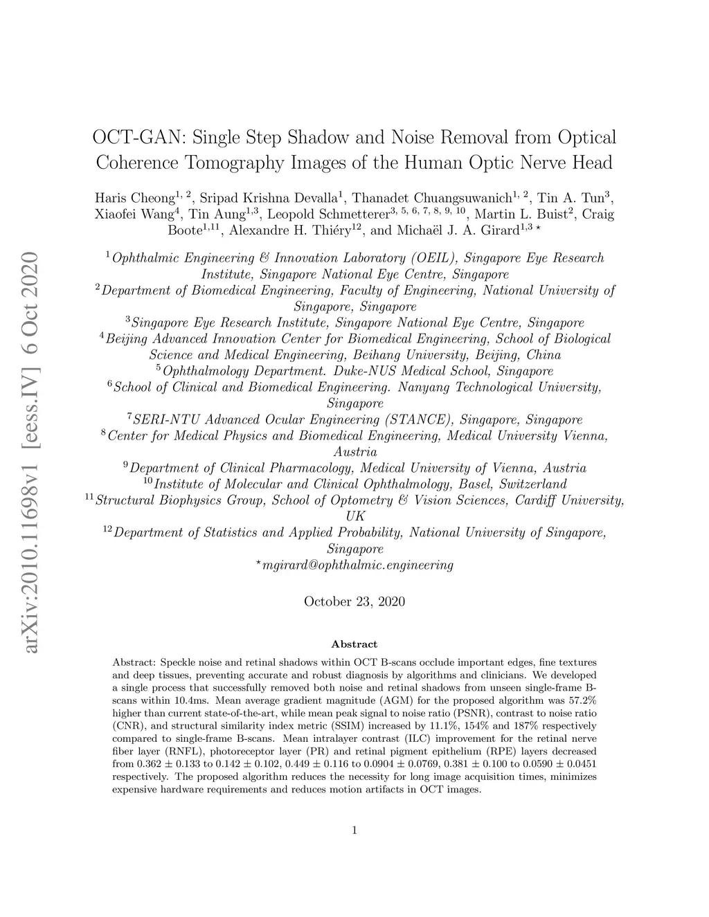OCT-GAN: Single Step Shadow and Noise Removal from Optical Coherence