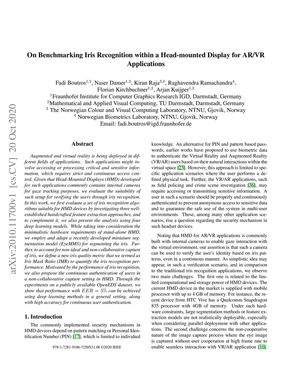 On Benchmarking Iris Recognition within a Head-mounted Display for AR/VR