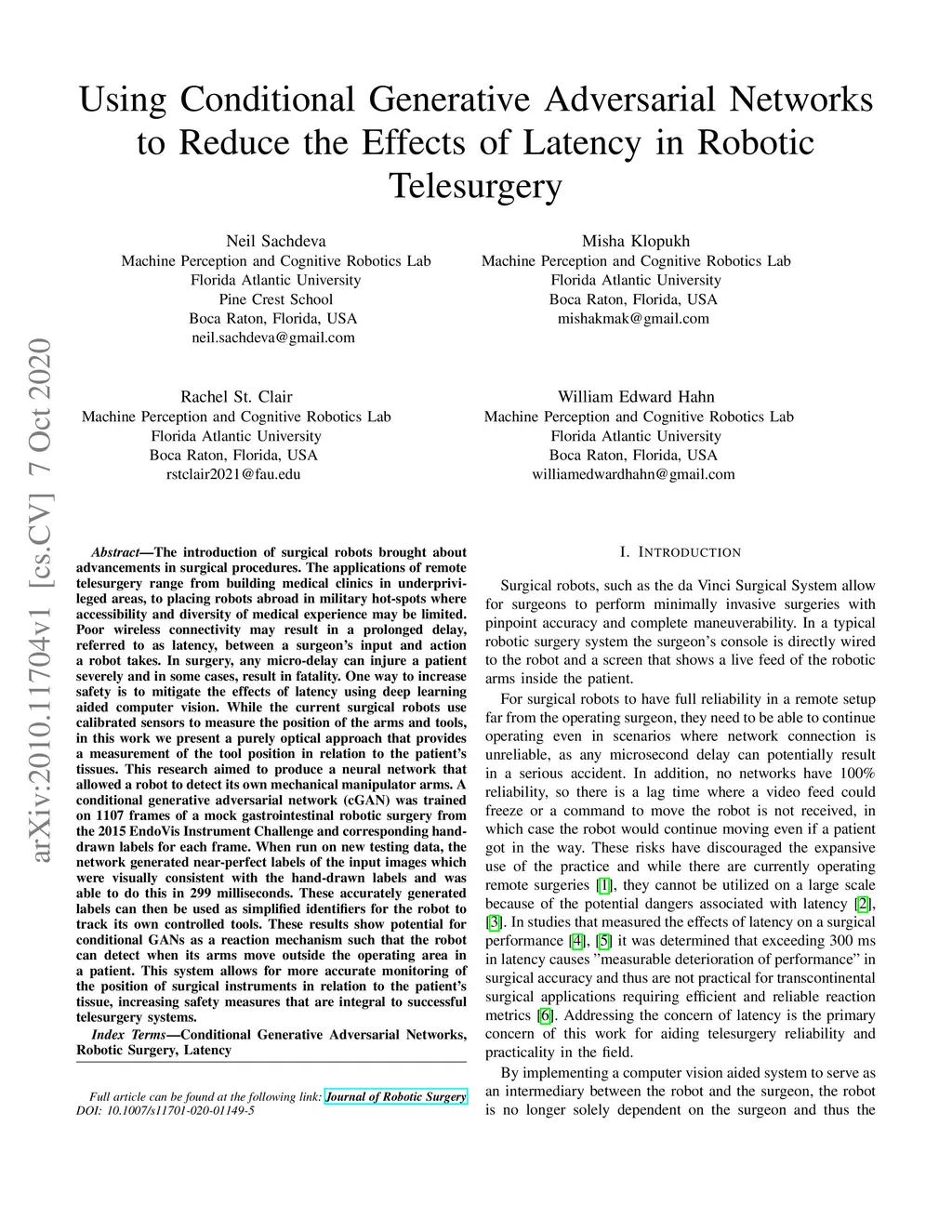 The introduction of surgical robots brought about advancements in surgical procedures. The applications of remote telesurgery range from building medical clinics in underprivileged areas, to placing robots abroad in military hot-spots where accessibility and diversity of medical experience may be limited. Poor wireless connectivity may result in a prolonged delay, referred to as latency, between a surgeon's input and action a robot takes. In surgery, any micro-delay can injure a patient severely and in some cases, result in fatality. One was to increase safety is to mitigate the effects of latency using deep learning aided computer vision. While the current surgical robots use calibrated sensors to measure the position of the arms and tools, in this work we present a purely optical approach that provides a measurement of the tool position in relation to the patient's tissues. This research aimed to produce a neural network that allowed a robot to detect its own mechanical manipulator arms. A conditional generative adversarial networks (cGAN) was trained on 1107 frames of mock gastrointestinal robotic surgery data from the 2015 EndoVis Instrument Challenge and corresponding hand-drawn labels for each frame. When run on new testing data, the network generated near-perfect labels of the input images which were visually consistent with the hand-drawn labels and was able to do this in 299 milliseconds. These accurately generated labels can then be used as simplified identifiers for the robot to track its own controlled tools. These results show potential for conditional GANs as a reaction mechanism such that the robot can detect when its arms move outside the operating area within a patient. This system allows for more accurate monitoring of the position of surgical instruments in relation to the patient's tissue, increasing safety measures that are integral to successful telesurgery systems.