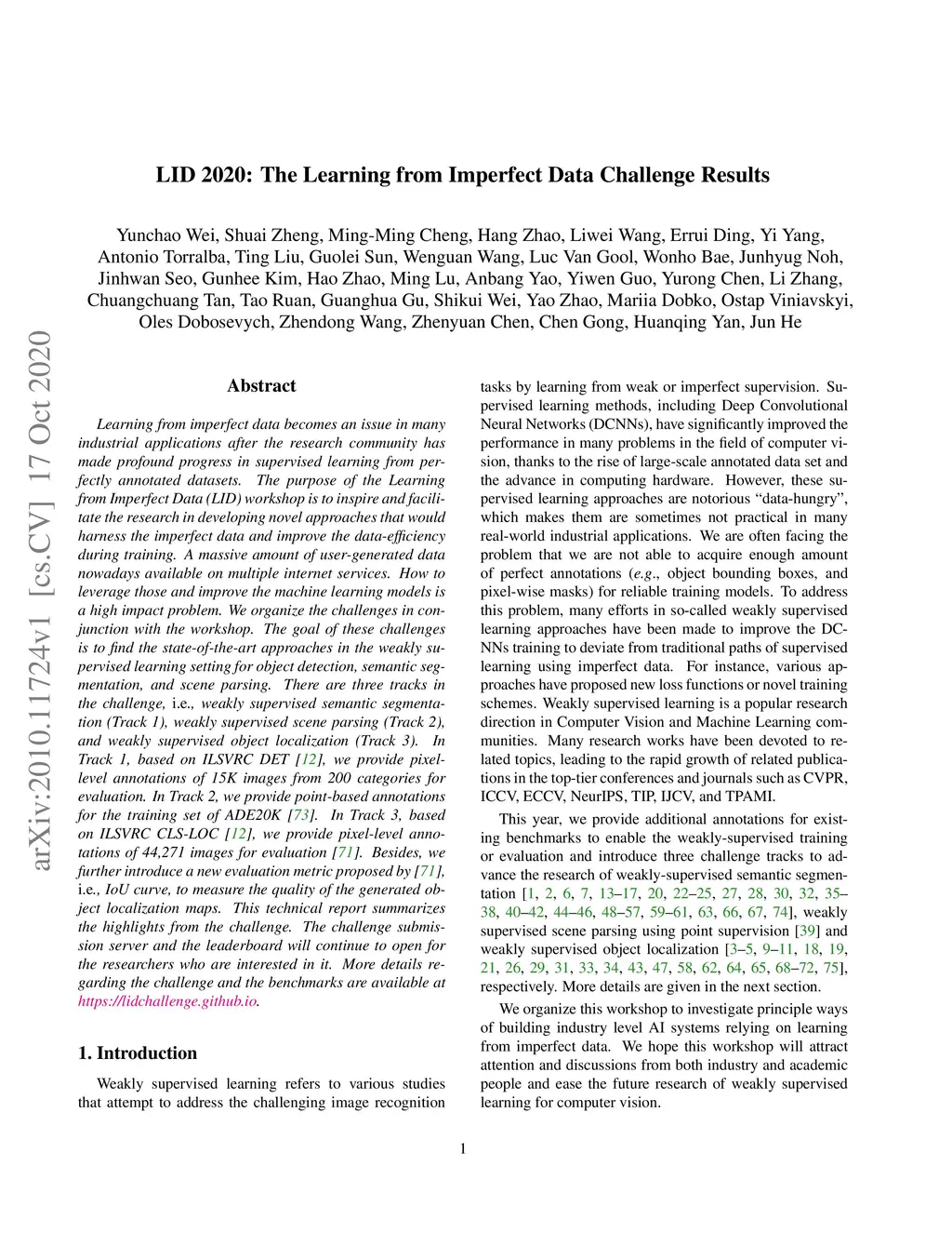 Learning from imperfect data becomes an issue in many industrial applications after the research community has made profound progress in supervised learning from perfectly annotated datasets. The purpose of the Learning from Imperfect Data (LID) workshop is to inspire and facilitate the research in developing novel approaches that would harness the imperfect data and improve the data-efficiency during training. A massive amount of user-generated data nowadays available on multiple internet services. How to leverage those and improve the machine learning models is a high impact problem. We organize the challenges in conjunction with the workshop. The goal of these challenges is to find the state-of-the-art approaches in the weakly supervised learning setting for object detection, semantic segmentation, and scene parsing. There are three tracks in the challenge, i.e., weakly supervised semantic segmentation (Track 1), weakly supervised scene parsing (Track 2), and weakly supervised object localization (Track 3). In Track 1, based on ILSVRC DET, we provide pixel-level annotations of 15K images from 200 categories for evaluation. In Track 2, we provide point-based annotations for the training set of ADE20K. In Track 3, based on ILSVRC CLS-LOC, we provide pixel-level annotations of 44,271 images for evaluation. Besides, we further introduce a new evaluation metric proposed by \cite{zhang2020rethinking}, i.e., IoU curve, to measure the quality of the generated object localization maps. This technical report summarizes the highlights from the challenge. The challenge submission server and the leaderboard will continue to open for the researchers who are interested in it. More details regarding the challenge and the benchmarks are available at https://lidchallenge.github.io