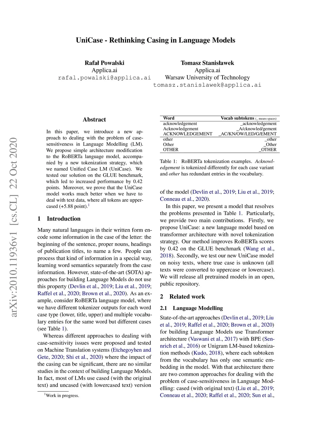 In this paper, we introduce a new approach to dealing with the problem of case-sensitiveness in Language Modelling (LM). We propose simple architecture modification to the RoBERTa language model, accompanied by a new tokenization strategy, which we named Unified Case LM (UniCase). We tested our solution on the GLUE benchmark, which led to increased performance by 0.42 points. Moreover, we prove that the UniCase model works much better when we have to deal with text data, where all tokens are uppercased (+5.88 point).