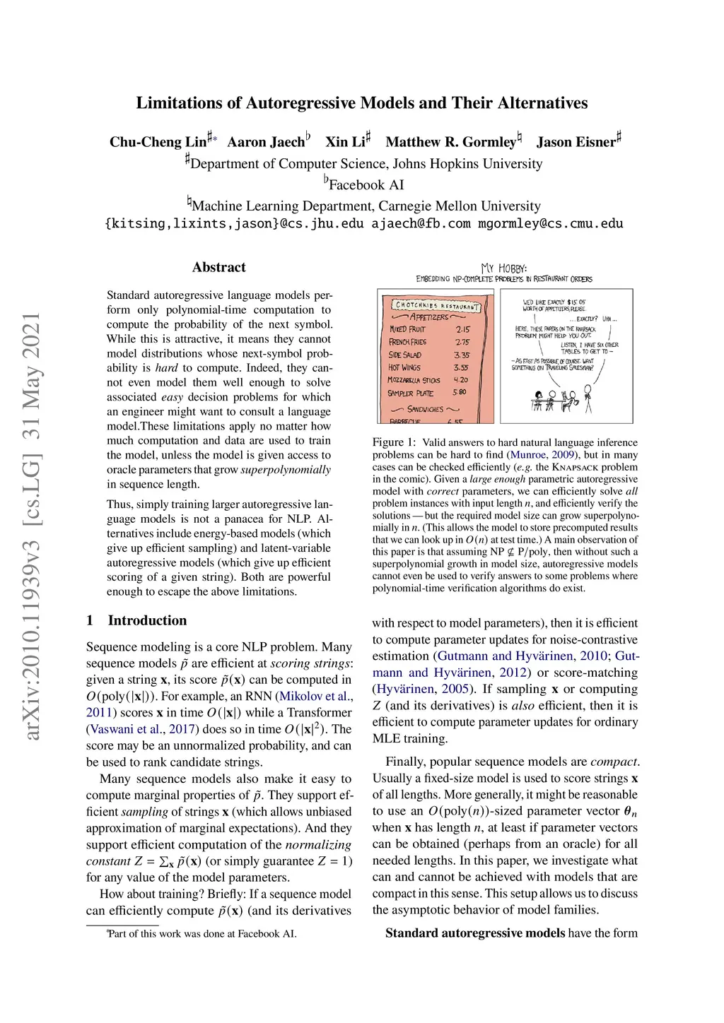 Standard autoregressive language models perform only polynomial-time computation to compute the probability of the next symbol. While this is attractive, it means they cannot model distributions whose next-symbol probability is hard to compute. Indeed, they cannot even model them well enough to solve associated easy decision problems for which an engineer might want to consult a language model. These limitations apply no matter how much computation and data are used to train the model, unless the model is given access to oracle parameters that grow superpolynomially in sequence length. Thus, simply training larger autoregressive language models is not a panacea for NLP. Alternatives include energy-based models (which give up efficient sampling) and latent-variable autoregressive models (which give up efficient scoring of a given string). Both are powerful enough to escape the above limitations.