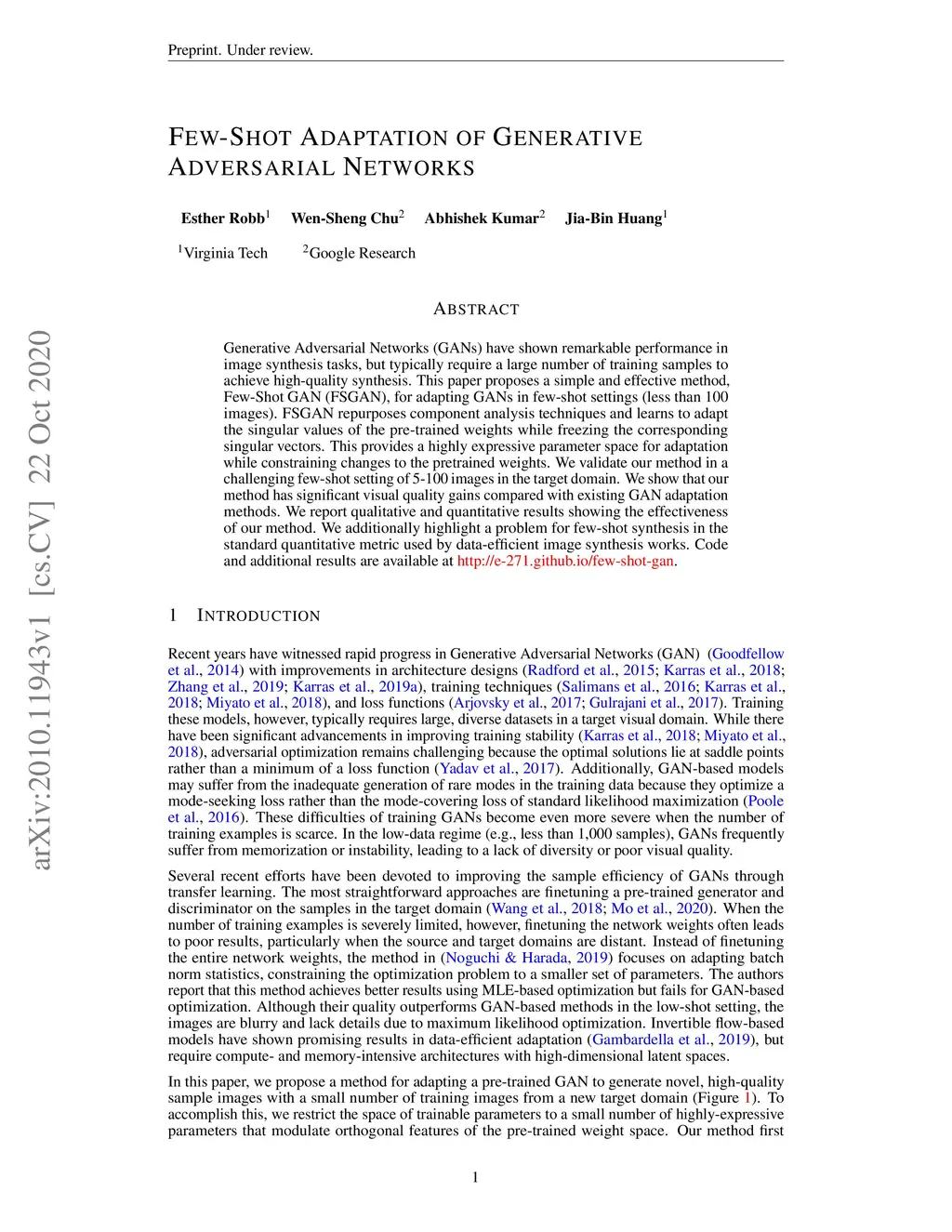 Few-Shot Adaptation of Generative Adversarial Networks