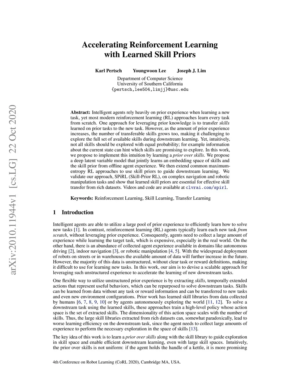 Intelligent agents rely heavily on prior experience when learning a new task, yet most modern reinforcement learning (RL) approaches learn every task from scratch. One approach for leveraging prior knowledge is to transfer skills learned on prior tasks to the new task. However, as the amount of prior experience increases, the number of transferable skills grows too, making it challenging to explore the full set of available skills during downstream learning. Yet, intuitively, not all skills should be explored with equal probability; for example information about the current state can hint which skills are promising to explore. In this work, we propose to implement this intuition by learning a prior over skills. We propose a deep latent variable model that jointly learns an embedding space of skills and the skill prior from offline agent experience. We then extend common maximum-entropy RL approaches to use skill priors to guide downstream learning. We validate our approach, SPiRL (Skill-Prior RL), on complex navigation and robotic manipulation tasks and show that learned skill priors are essential for effective skill transfer from rich datasets. Videos and code are available at https://clvrai.com/spirl.