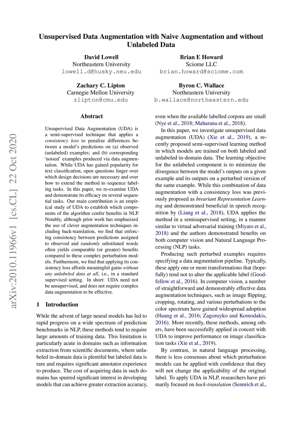 Unsupervised Data Augmentation (UDA) is a semi-supervised technique that applies a consistency loss to penalize differences between a model's predictions on (a) observed (unlabeled) examples; and (b) corresponding ñoised' examples produced via data augmentation. While UDA has gained popularity for text classification, open questions linger over which design decisions are necessary and over how to extend the method to sequence labeling tasks. This method has recently gained traction for text classification. In this paper, we re-examine UDA and demonstrate its efficacy on several sequential tasks. Our main contribution is an empirical study of UDA to establish which components of the algorithm confer benefits in NLP. Notably, although prior work has emphasized the use of clever augmentation techniques including back-translation, we find that enforcing consistency between predictions assigned to observed and randomly substituted words often yields comparable (or greater) benefits compared to these complex perturbation models. Furthermore, we find that applying its consistency loss affords meaningful gains without any unlabeled data at all, i.e., in a standard supervised setting. In short: UDA need not be unsupervised, and does not require complex data augmentation to be effective.
