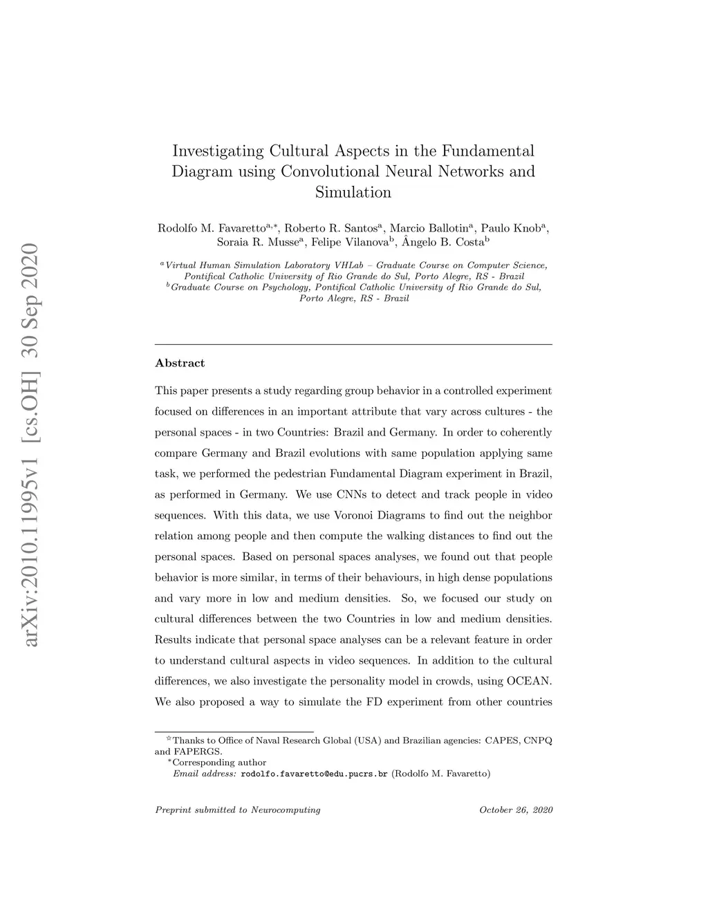 This paper presents a study regarding group behavior in a controlled experiment focused on differences in an important attribute that vary across cultures -- the personal spaces -- in two Countries: Brazil and Germany. In order to coherently compare Germany and Brazil evolutions with same population applying same task, we performed the pedestrian Fundamental Diagram experiment in Brazil, as performed in Germany. We use CNNs to detect and track people in video sequences. With this data, we use Voronoi Diagrams to find out the neighbor relation among people and then compute the walking distances to find out the personal spaces. Based on personal spaces analyses, we found out that people behavior is more similar, in terms of their behaviours, in high dense populations and vary more in low and medium densities. So, we focused our study on cultural differences between the two Countries in low and medium densities. Results indicate that personal space analyses can be a relevant feature in order to understand cultural aspects in video sequences. In addition to the cultural differences, we also investigate the personality model in crowds, using OCEAN. We also proposed a way to simulate the FD experiment from other countries using the OCEAN psychological traits model as input. The simulated countries were consistent with the literature.