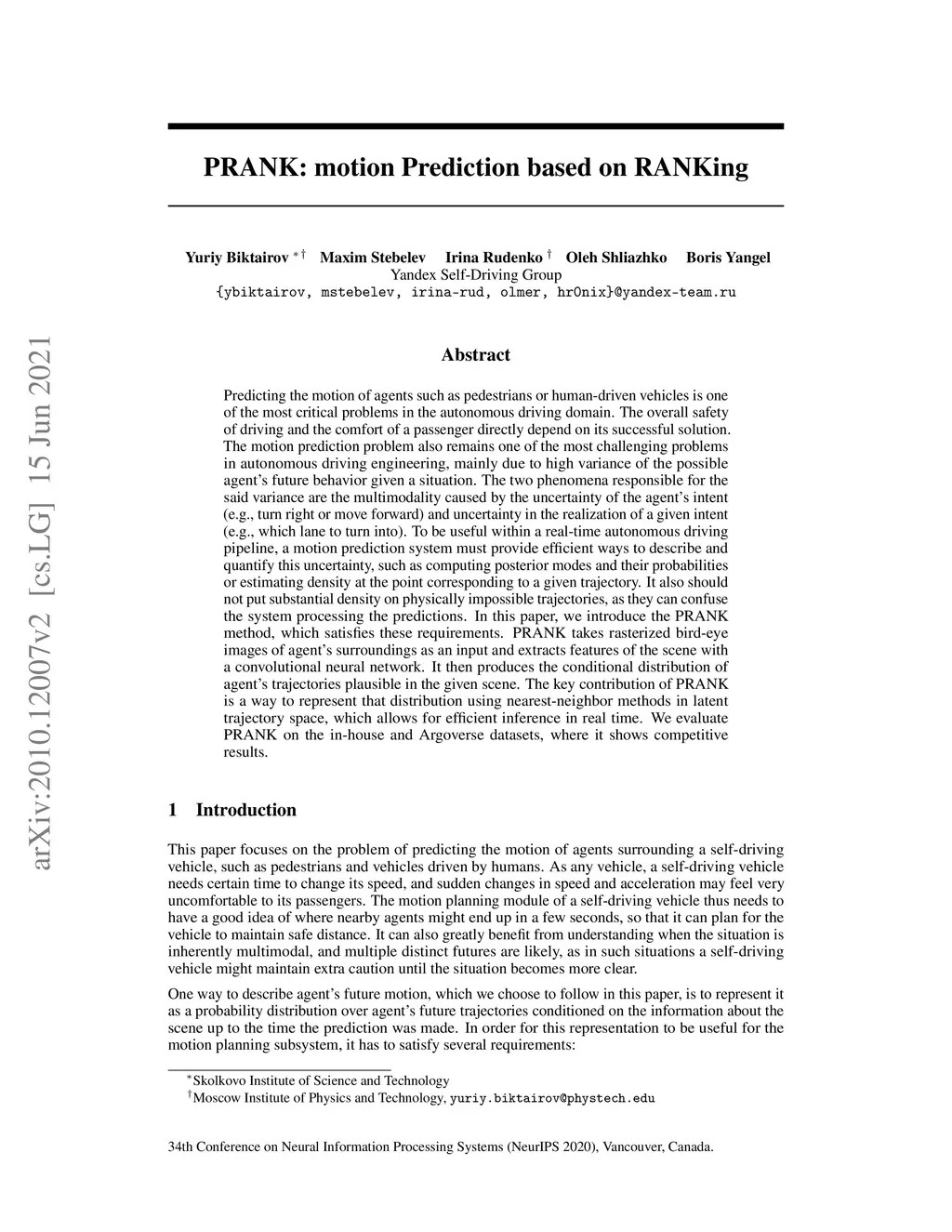 Predicting the motion of agents such as pedestrians or human-driven vehicles is one of the most critical problems in the autonomous driving domain. The overall safety of driving and the comfort of a passenger directly depend on its successful solution. The motion prediction problem also remains one of the most challenging problems in autonomous driving engineering, mainly due to high variance of the possible agent's future behavior given a situation. The two phenomena responsible for the said variance are the multimodality caused by the uncertainty of the agent's intent (e.g., turn right or move forward) and uncertainty in the realization of a given intent (e.g., which lane to turn into). To be useful within a real-time autonomous driving pipeline, a motion prediction system must provide efficient ways to describe and quantify this uncertainty, such as computing posterior modes and their probabilities or estimating density at the point corresponding to a given trajectory. It also should not put substantial density on physically impossible trajectories, as they can confuse the system processing the predictions. In this paper, we introduce the PRANK method, which satisfies these requirements. PRANK takes rasterized bird-eye images of agent's surroundings as an input and extracts features of the scene with a convolutional neural network. It then produces the conditional distribution of agent's trajectories plausible in the given scene. The key contribution of PRANK is a way to represent that distribution using nearest-neighbor methods in latent trajectory space, which allows for efficient inference in real time. We evaluate PRANK on the in-house and Argoverse datasets, where it shows competitive results.