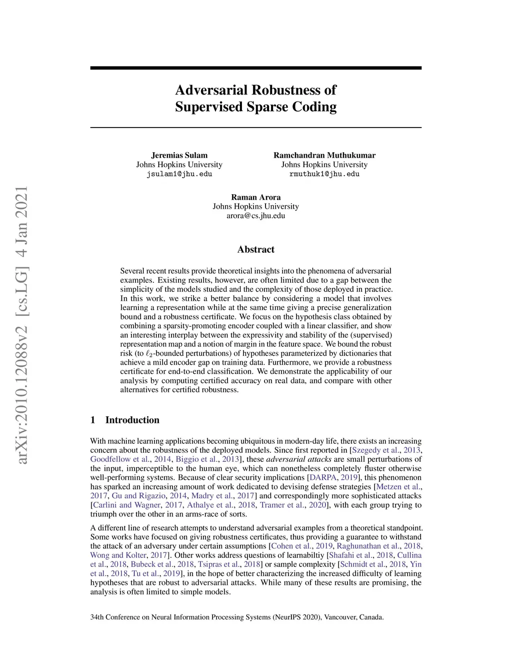 Several recent results provide theoretical insights into the phenomena of adversarial examples. Existing results, however, are often limited due to a gap between the simplicity of the models studied and the complexity of those deployed in practice. In this work, we strike a better balance by considering a model that involves learning a representation while at the same time giving a precise generalization bound and a robustness certificate. We focus on the hypothesis class obtained by combining a sparsity-promoting encoder coupled with a linear classifier, and show an interesting interplay between the expressivity and stability of the (supervised) representation map and a notion of margin in the feature space. We bound the robust risk (to -bounded perturbations) of hypotheses parameterized by dictionaries that achieve a mild encoder gap on training data. Furthermore, we provide a robustness certificate for end-to-end classification. We demonstrate the applicability of our analysis by computing certified accuracy on real data, and compare with other alternatives for certified robustness.