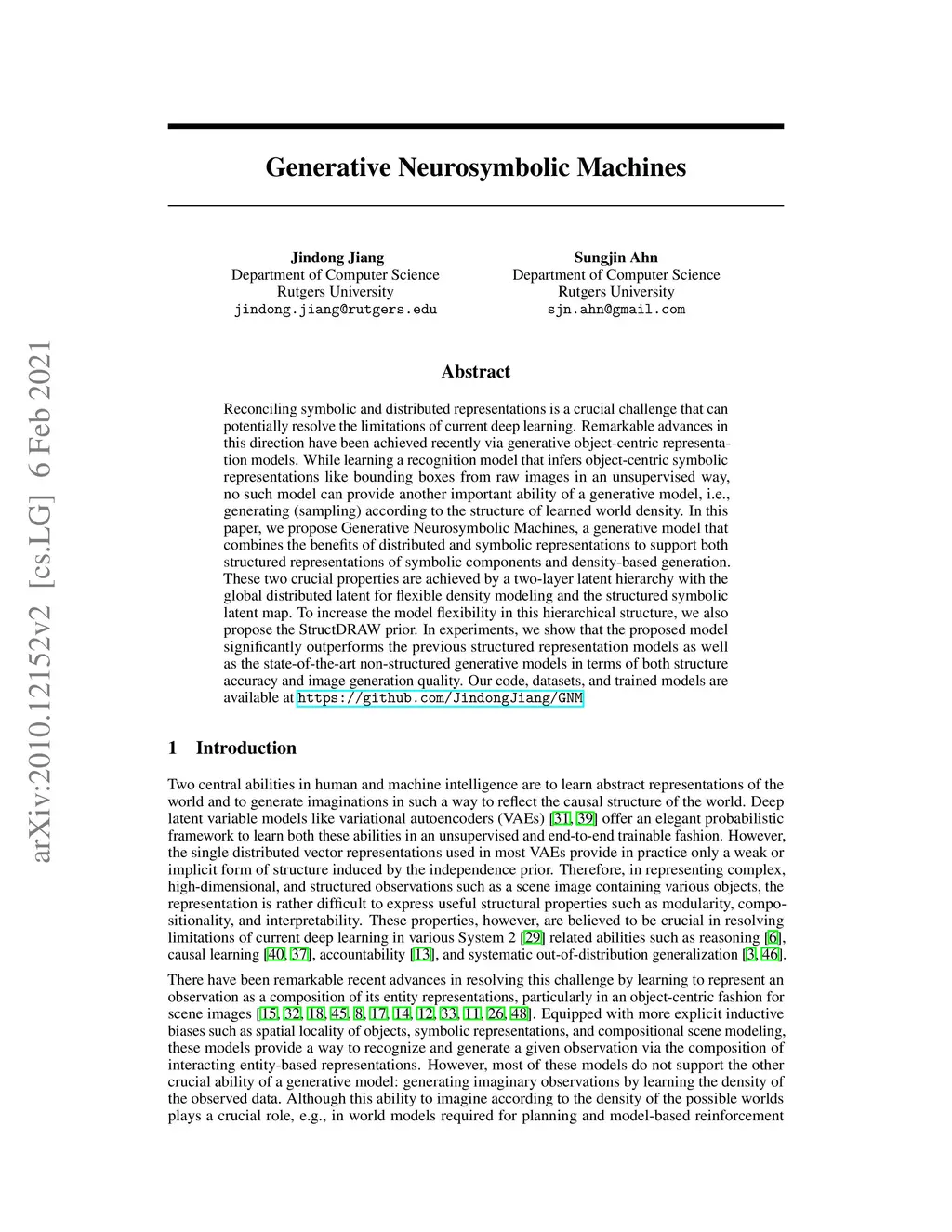 Reconciling symbolic and distributed representations is a crucial challenge that can potentially resolve the limitations of current deep learning. Remarkable advances in this direction have been achieved recently via generative object-centric representation models. While learning a recognition model that infers object-centric symbolic representations like bounding boxes from raw images in an unsupervised way, no such model can provide another important ability of a generative model, i.e., generating (sampling) according to the structure of learned world density. In this paper, we propose Generative Neurosymbolic Machines, a generative model that combines the benefits of distributed and symbolic representations to support both structured representations of symbolic components and density-based generation. These two crucial properties are achieved by a two-layer latent hierarchy with the global distributed latent for flexible density modeling and the structured symbolic latent map. To increase the model flexibility in this hierarchical structure, we also propose the StructDRAW prior. In experiments, we show that the proposed model significantly outperforms the previous structured representation models as well as the state-of-the-art non-structured generative models in terms of both structure accuracy and image generation quality. Our code, datasets, and trained models are available at https://github.com/JindongJiang/GNM