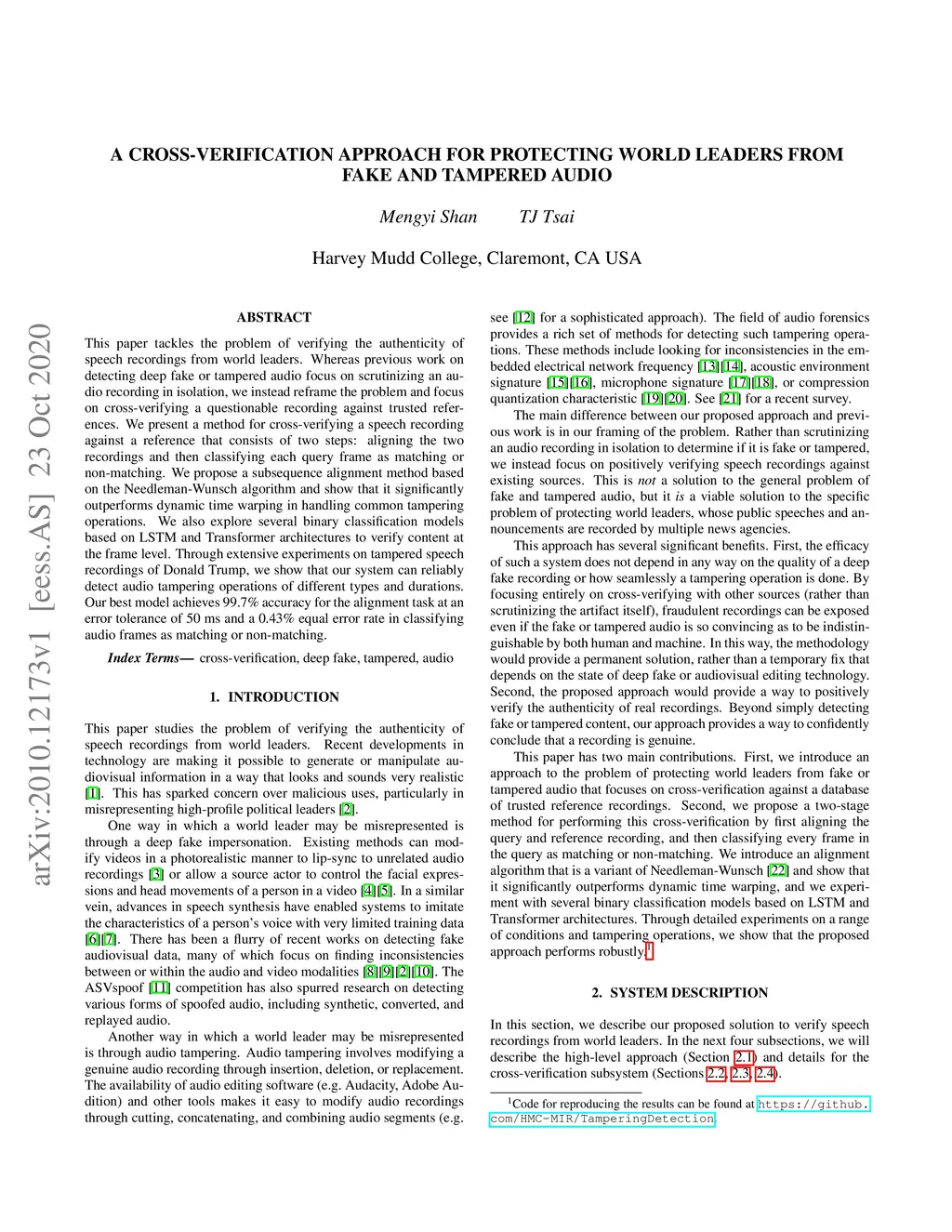 This paper tackles the problem of verifying the authenticity of speech recordings from world leaders. Whereas previous work on detecting deep fake or tampered audio focus on scrutinizing an audio recording in isolation, we instead reframe the problem and focus on cross-verifying a questionable recording against trusted references. We present a method for cross-verifying a speech recording against a reference that consists of two steps: aligning the two recordings and then classifying each query frame as matching or non-matching. We propose a subsequence alignment method based on the Needleman-Wunsch algorithm and show that it significantly outperforms dynamic time warping in handling common tampering operations. We also explore several binary classification models based on LSTM and Transformer architectures to verify content at the frame level. Through extensive experiments on tampered speech recordings of Donald Trump, we show that our system can reliably detect audio tampering operations of different types and durations. Our best model achieves 99.7% accuracy for the alignment task at an error tolerance of 50 ms and a 0.43% equal error rate in classifying audio frames as matching or non-matching.