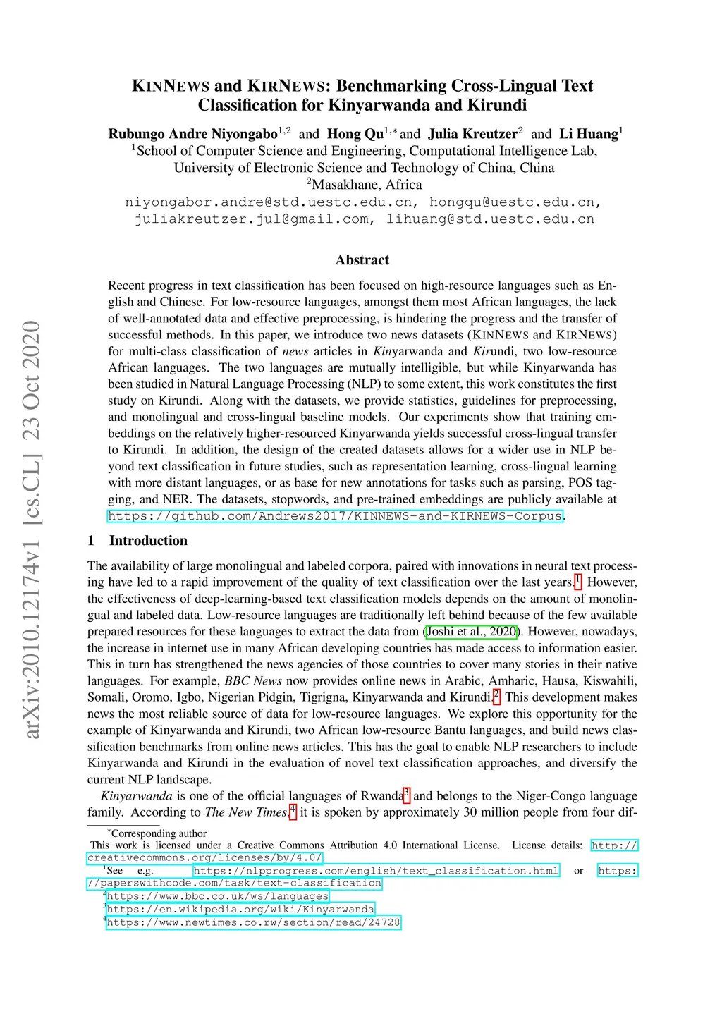 KINNEWS and KIRNEWS: Benchmarking Cross-Lingual Text Classification for