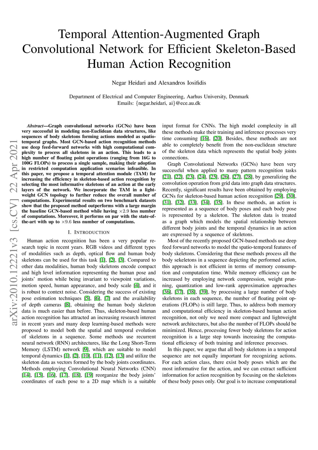 Graph convolutional networks (GCNs) have been very successful in modeling non-Euclidean data structures, like sequences of body skeletons forming actions modeled as spatio-temporal graphs. Most GCN-based action recognition methods use deep feed-forward networks with high computational complexity to process all skeletons in an action. This leads to a high number of floating point operations (ranging from 16G to 100G FLOPs) to process a single sample, making their adoption in restricted computation application scenarios infeasible. In this paper, we propose a temporal attention module (TAM) for increasing the efficiency in skeleton-based action recognition by selecting the most informative skeletons of an action at the early layers of the network. We incorporate the TAM in a light-weight GCN topology to further reduce the overall number of computations. Experimental results on two benchmark datasets show that the proposed method outperforms with a large margin the baseline GCN-based method while having 2.9 times less number of computations. Moreover, it performs on par with the state-of-the-art with up to 9.6 times less number of computations.