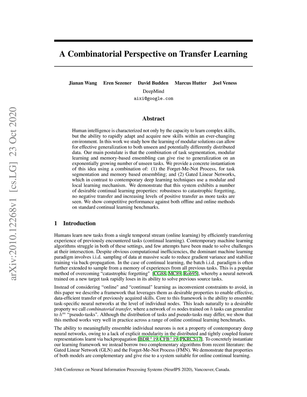 Human intelligence is characterized not only by the capacity to learn complex skills, but the ability to rapidly adapt and acquire new skills within an ever-changing environment. In this work we study how the learning of modular solutions can allow for effective generalization to both unseen and potentially differently distributed data. Our main postulate is that the combination of task segmentation, modular learning and memory-based ensembling can give rise to generalization on an exponentially growing number of unseen tasks. We provide a concrete instantiation of this idea using a combination of: (1) the Forget-Me-Not Process, for task segmentation and memory based ensembling; and (2) Gated Linear Networks, which in contrast to contemporary deep learning techniques use a modular and local learning mechanism. We demonstrate that this system exhibits a number of desirable continual learning properties: robustness to catastrophic forgetting, no negative transfer and increasing levels of positive transfer as more tasks are seen. We show competitive performance against both offline and online methods on standard continual learning benchmarks.