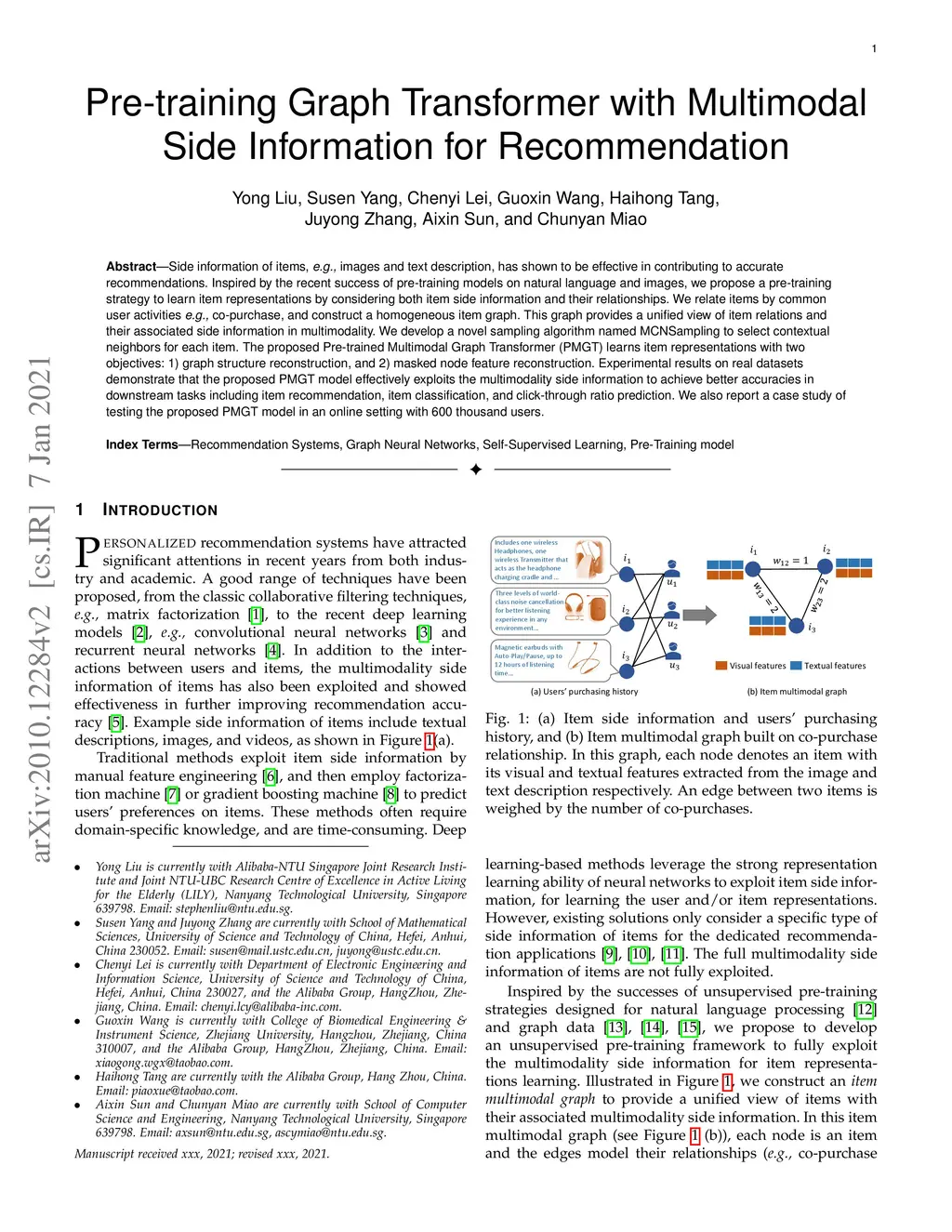 Side information of items, e.g., images and text description, has shown to be effective in contributing to accurate recommendations. Inspired by the recent success of pre-training models on natural language and images, we propose a pre-training strategy to learn item representations by considering both item side information and their relationships. We relate items by common user activities, e.g., co-purchase, and construct a homogeneous item graph. This graph provides a unified view of item relations and their associated side information in multimodality. We develop a novel sampling algorithm named MCNSampling to select contextual neighbors for each item. The proposed Pre-trained Multimodal Graph Transformer (PMGT) learns item representations with two objectives: 1) graph structure reconstruction, and 2) masked node feature reconstruction. Experimental results on real datasets demonstrate that the proposed PMGT model effectively exploits the multimodality side information to achieve better accuracies in downstream tasks including item recommendation, item classification, and click-through ratio prediction. We also report a case study of testing the proposed PMGT model in an online setting with 600 thousand users.