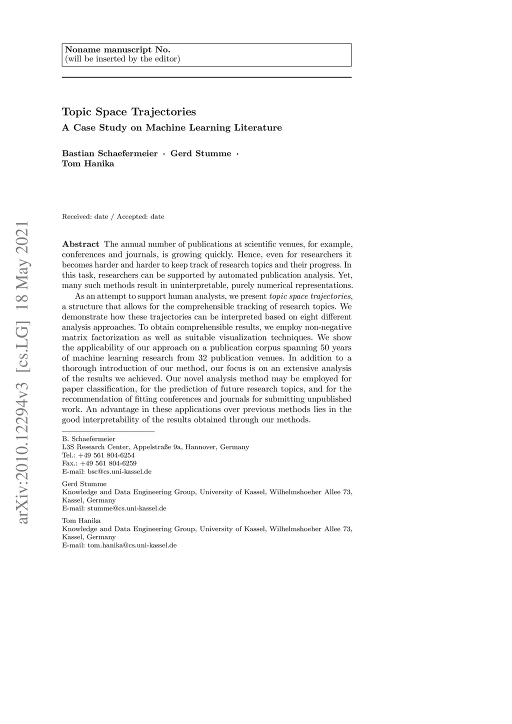 The annual number of publications at scientific venues, for example, conferences and journals, is growing quickly. Hence, even for researchers it becomes harder and harder to keep track of research topics and their progress. In this task, researchers can be supported by automated publication analysis. Yet, many such methods result in uninterpretable, purely numerical representations. As an attempt to support human analysts, we present topic space trajectories, a structure that allows for the comprehensible tracking of research topics. We demonstrate how these trajectories can be interpreted based on eight different analysis approaches. To obtain comprehensible results, we employ non-negative matrix factorization as well as suitable visualization techniques. We show the applicability of our approach on a publication corpus spanning 50 years of machine learning research from 32 publication venues. Our novel analysis method may be employed for paper classification, for the prediction of future research topics, and for the recommendation of fitting conferences and journals for submitting unpublished work.