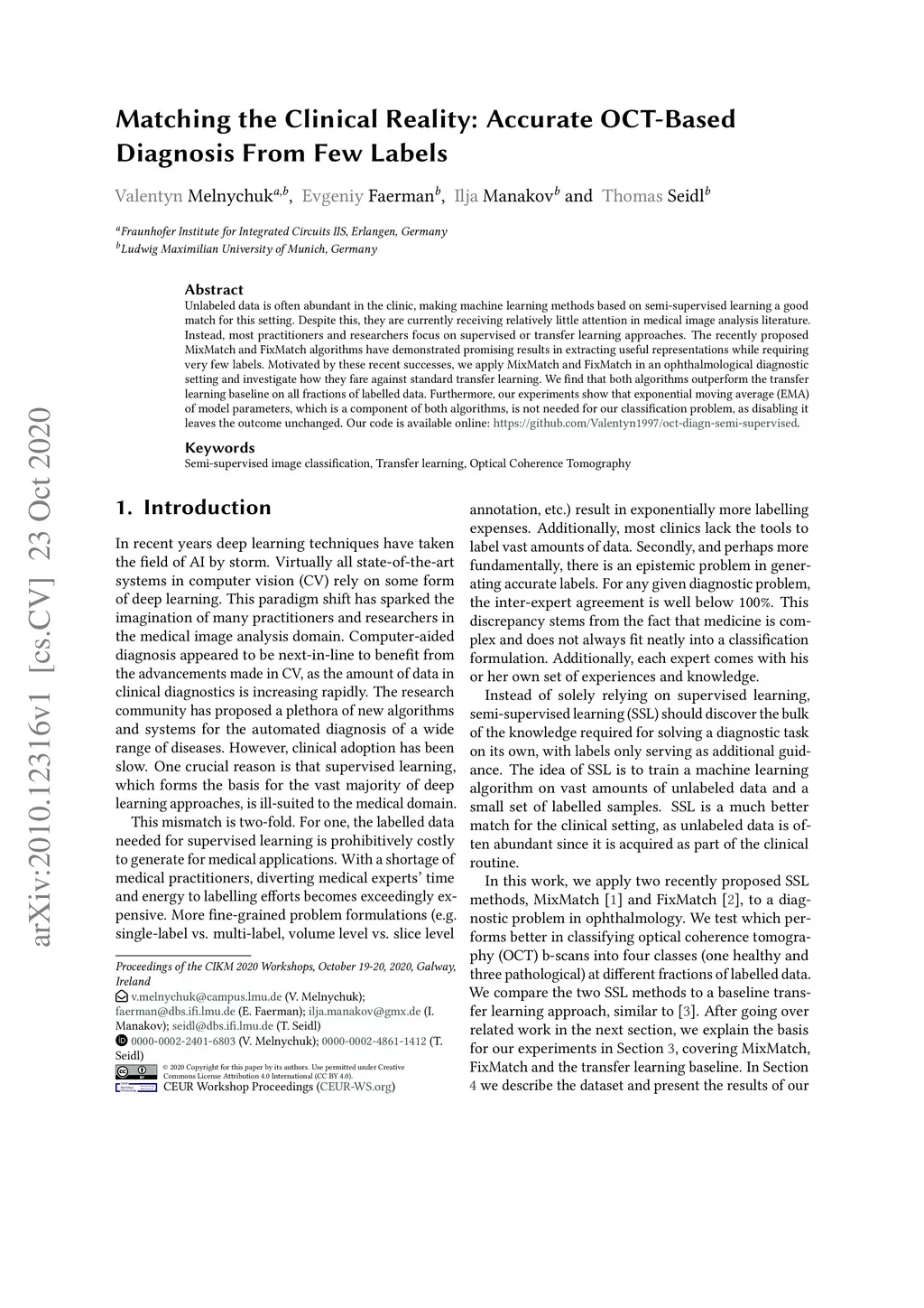 Unlabeled data is often abundant in the clinic, making machine learning methods based on semi-supervised learning a good match for this setting. Despite this, they are currently receiving relatively little attention in medical image analysis literature. Instead, most practitioners and researchers focus on supervised or transfer learning approaches. The recently proposed MixMatch and FixMatch algorithms have demonstrated promising results in extracting useful representations while requiring very few labels. Motivated by these recent successes, we apply MixMatch and FixMatch in an ophthalmological diagnostic setting and investigate how they fare against standard transfer learning. We find that both algorithms outperform the transfer learning baseline on all fractions of labelled data. Furthermore, our experiments show that exponential moving average (EMA) of model parameters, which is a component of both algorithms, is not needed for our classification problem, as disabling it leaves the outcome unchanged. Our code is available online: https://github.com/Valentyn1997/oct-diagn-semi-supervised