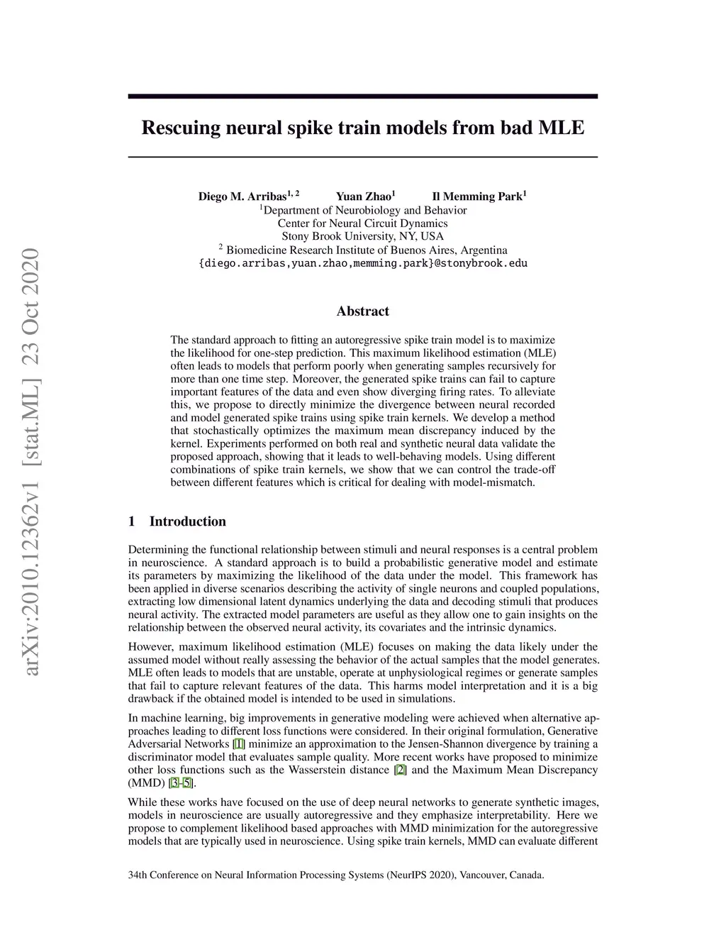 The standard approach to fitting an autoregressive spike train model is to maximize the likelihood for one-step prediction. This maximum likelihood estimation (MLE) often leads to models that perform poorly when generating samples recursively for more than one time step. Moreover, the generated spike trains can fail to capture important features of the data and even show diverging firing rates. To alleviate this, we propose to directly minimize the divergence between neural recorded and model generated spike trains using spike train kernels. We develop a method that stochastically optimizes the maximum mean discrepancy induced by the kernel. Experiments performed on both real and synthetic neural data validate the proposed approach, showing that it leads to well-behaving models. Using different combinations of spike train kernels, we show that we can control the trade-off between different features which is critical for dealing with model-mismatch.