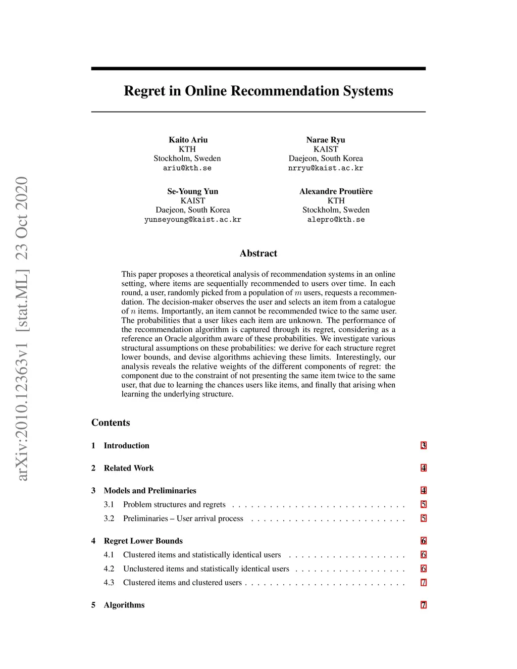 This paper proposes a theoretical analysis of recommendation systems in an online setting, where items are sequentially recommended to users over time. In each round, a user, randomly picked from a population of users, requests a recommendation. The decision-maker observes the user and selects an item from a catalogue of items. Importantly, an item cannot be recommended twice to the same user. The probabilities that a user likes each item are unknown. The performance of the recommendation algorithm is captured through its regret, considering as a reference an Oracle algorithm aware of these probabilities. We investigate various structural assumptions on these probabilities: we derive for each structure regret lower bounds, and devise algorithms achieving these limits. Interestingly, our analysis reveals the relative weights of the different components of regret: the component due to the constraint of not presenting the same item twice to the same user, that due to learning the chances users like items, and finally that arising when learning the underlying structure.
