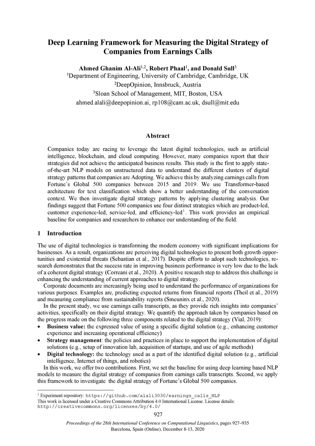 Companies today are racing to leverage the latest digital technologies, such as artificial intelligence, blockchain, and cloud computing. However, many companies report that their strategies did not achieve the anticipated business results. This study is the first to apply state of the art NLP models on unstructured data to understand the different clusters of digital strategy patterns that companies are Adopting. We achieve this by analyzing earnings calls from Fortune Global 500 companies between 2015 and 2019. We use Transformer based architecture for text classification which show a better understanding of the conversation context. We then investigate digital strategy patterns by applying clustering analysis. Our findings suggest that Fortune 500 companies use four distinct strategies which are product led, customer experience led, service led, and efficiency led. This work provides an empirical baseline for companies and researchers to enhance our understanding of the field.