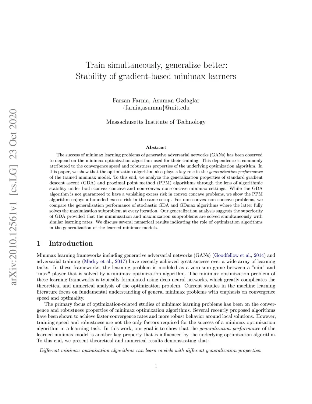 The success of minimax learning problems of generative adversarial networks (GANs) has been observed to depend on the minimax optimization algorithm used for their training. This dependence is commonly attributed to the convergence speed and robustness properties of the underlying optimization algorithm. In this paper, we show that the optimization algorithm also plays a key role in the generalization performance of the trained minimax model. To this end, we analyze the generalization properties of standard gradient descent ascent (GDA) and proximal point method (PPM) algorithms through the lens of algorithmic stability under both convex concave and non-convex non-concave minimax settings. While the GDA algorithm is not guaranteed to have a vanishing excess risk in convex concave problems, we show the PPM algorithm enjoys a bounded excess risk in the same setup. For non-convex non-concave problems, we compare the generalization performance of stochastic GDA and GDmax algorithms where the latter fully solves the maximization subproblem at every iteration. Our generalization analysis suggests the superiority of GDA provided that the minimization and maximization subproblems are solved simultaneously with similar learning rates. We discuss several numerical results indicating the role of optimization algorithms in the generalization of the learned minimax models.