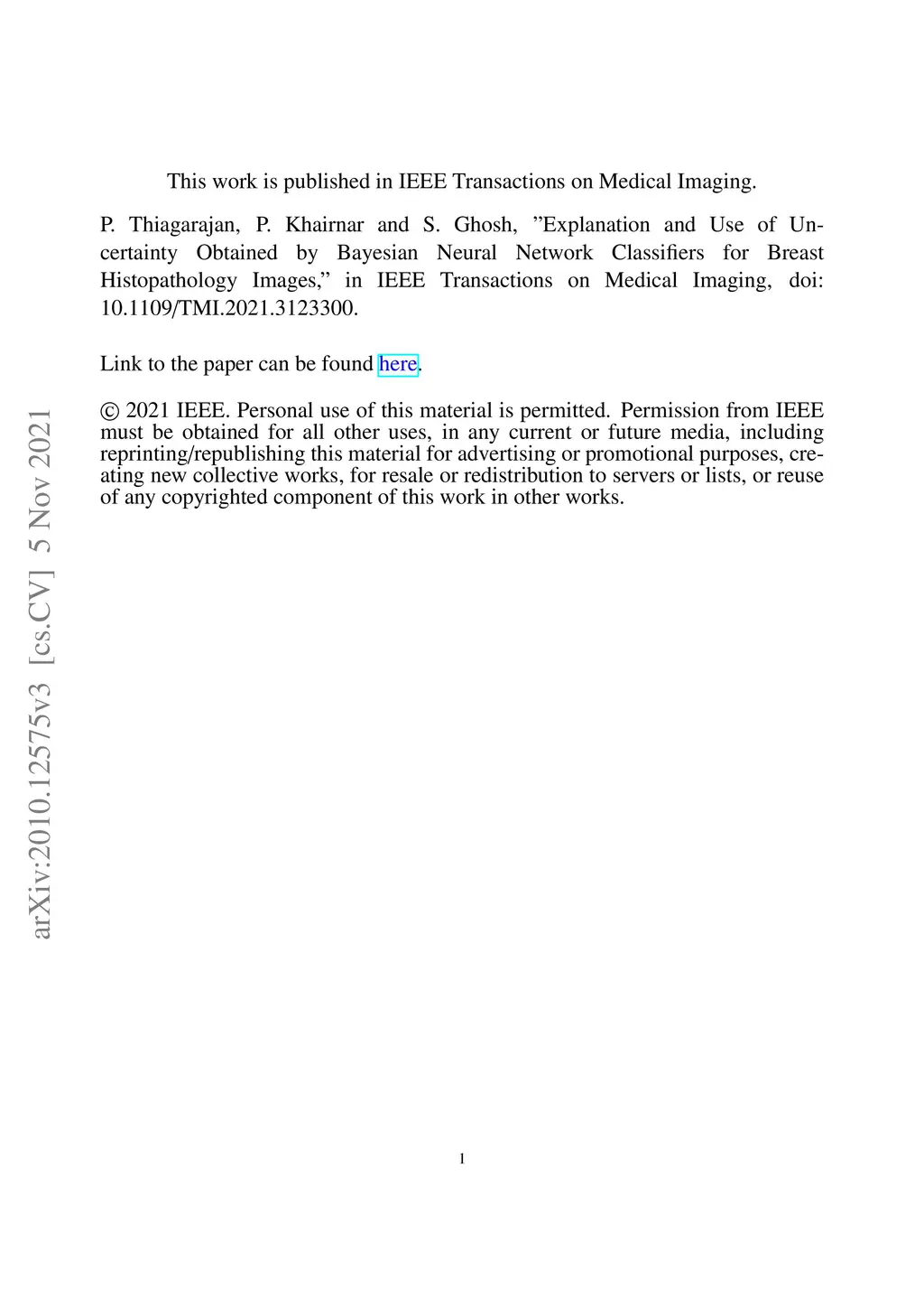 Despite the promise of Convolutional neural network (CNN) based classification models for histopathological images, it is infeasible to quantify its uncertainties. Moreover, CNNs may suffer from overfitting when the data is biased. We show that Bayesian-CNN can overcome these limitations by regularizing automatically and by quantifying the uncertainty. We have developed a novel technique to utilize the uncertainties provided by the Bayesian-CNN that significantly improves the performance on a large fraction of the test data (about 6% improvement in accuracy on 77% of test data). Further, we provide a novel explanation for the uncertainty by projecting the data into a low dimensional space through a nonlinear dimensionality reduction technique. This dimensionality reduction enables interpretation of the test data through visualization and reveals the structure of the data in a low dimensional feature space. We show that the Bayesian-CNN can perform much better than the state-of-the-art transfer learning CNN (TL-CNN) by reducing the false negative and false positive by 11% and 7.7% respectively for the present data set. It achieves this performance with only 1.86 million parameters as compared to 134.33 million for TL-CNN. Besides, we modify the Bayesian-CNN by introducing a stochastic adaptive activation function. The modified Bayesian-CNN performs slightly better than Bayesian-CNN on all performance metrics and significantly reduces the number of false negatives and false positives (3% reduction for both). We also show that these results are statistically significant by performing McNemar's statistical significance test. This work shows the advantages of Bayesian-CNN against the state-of-the-art, explains and utilizes the uncertainties for histopathological images. It should find applications in various medical image classifications.