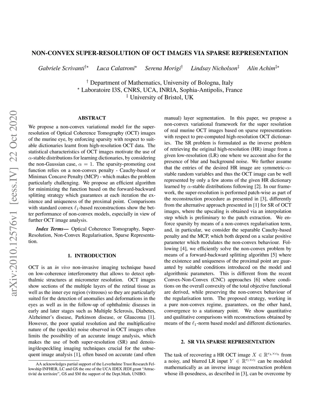 We propose a non-convex variational model for the super-resolution of Optical Coherence Tomography (OCT) images of the murine eye, by enforcing sparsity with respect to suitable dictionaries learnt from high-resolution OCT data. The statistical characteristics of OCT images motivate the use of {\alpha}-stable distributions for learning dictionaries, by considering the non-Gaussian case, {\alpha}=1. The sparsity-promoting cost function relies on a non-convex penalty - Cauchy-based or Minimax Concave Penalty (MCP) - which makes the problem particularly challenging. We propose an efficient algorithm for minimizing the function based on the forward-backward splitting strategy which guarantees at each iteration the existence and uniqueness of the proximal point. Comparisons with standard convex L1-based reconstructions show the better performance of non-convex models, especially in view of further OCT image analysis