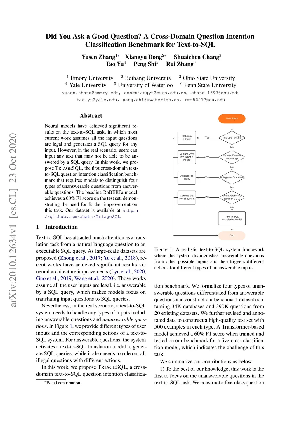 Neural models have achieved significant results on the text-to-SQL task, in which most current work assumes all the input questions are legal and generates a SQL query for any input. However, in the real scenario, users can input any text that may not be able to be answered by a SQL query. In this work, we propose TriageSQL, the first cross-domain text-to-SQL question intention classification benchmark that requires models to distinguish four types of unanswerable questions from answerable questions. The baseline RoBERTa model achieves a 60% F1 score on the test set, demonstrating the need for further improvement on this task. Our dataset is available at https://github.com/chatc/TriageSQL.