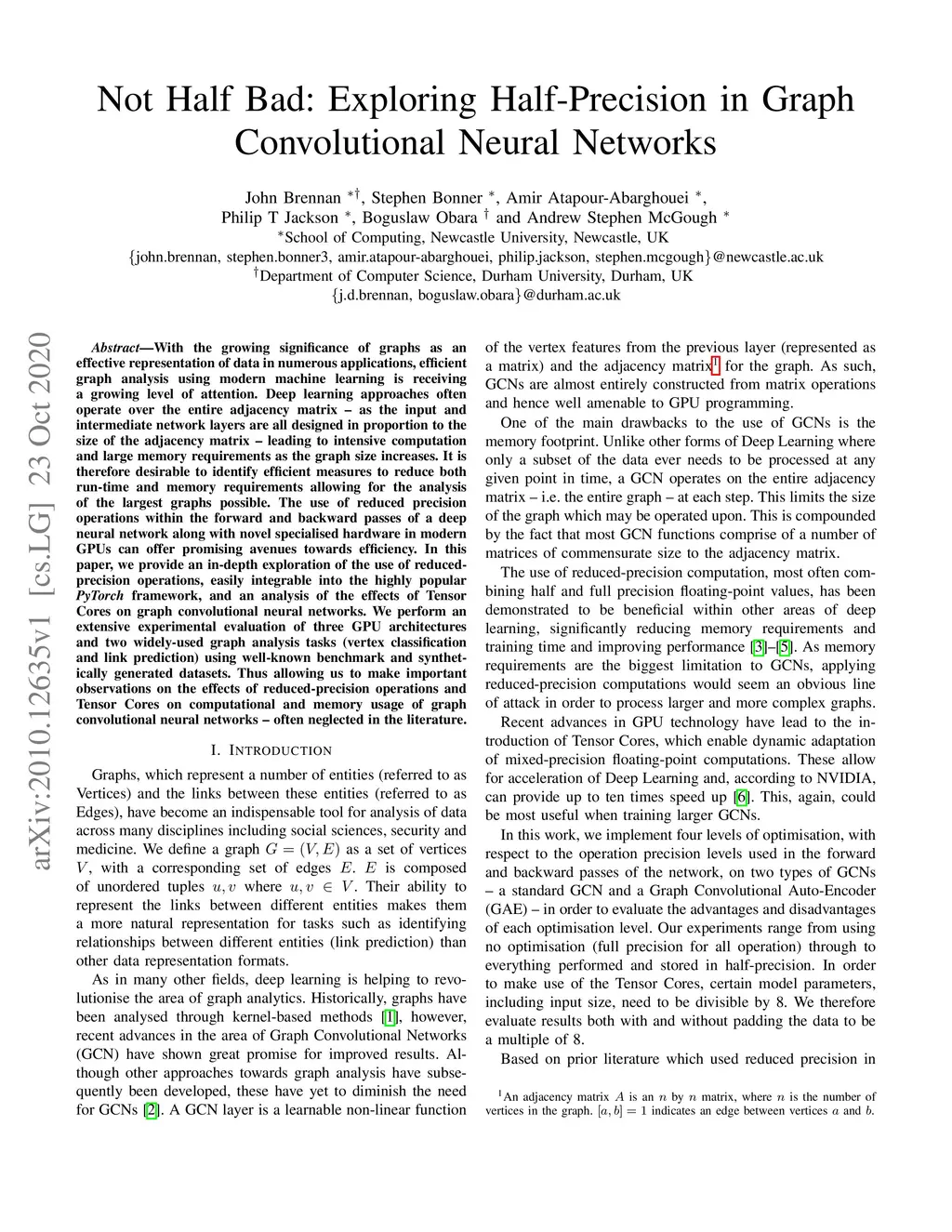 With the growing significance of graphs as an effective representation of data in numerous applications, efficient graph analysis using modern machine learning is receiving a growing level of attention. Deep learning approaches often operate over the entire adjacency matrix -- as the input and intermediate network layers are all designed in proportion to the size of the adjacency matrix -- leading to intensive computation and large memory requirements as the graph size increases. It is therefore desirable to identify efficient measures to reduce both run-time and memory requirements allowing for the analysis of the largest graphs possible. The use of reduced precision operations within the forward and backward passes of a deep neural network along with novel specialised hardware in modern GPUs can offer promising avenues towards efficiency. In this paper, we provide an in-depth exploration of the use of reduced-precision operations, easily integrable into the highly popular PyTorch framework, and an analysis of the effects of Tensor Cores on graph convolutional neural networks. We perform an extensive experimental evaluation of three GPU architectures and two widely-used graph analysis tasks (vertex classification and link prediction) using well-known benchmark and synthetically generated datasets. Thus allowing us to make important observations on the effects of reduced-precision operations and Tensor Cores on computational and memory usage of graph convolutional neural networks -- often neglected in the literature.