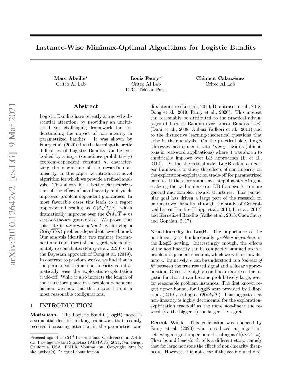 Logistic Bandits have recently attracted substantial attention, by providing an uncluttered yet challenging framework for understanding the impact of non-linearity in parametrized bandits. It was shown by Faury et al. (2020) that the learning-theoretic difficulties of Logistic Bandits can be embodied by a large (sometimes prohibitively) problem-dependent constant , characterizing the magnitude of the reward's non-linearity. In this paper we introduce a novel algorithm for which we provide a refined analysis. This allows for a better characterization of the effect of non-linearity and yields improved problem-dependent guarantees. In most favorable cases this leads to a regret upper-bound scaling as , which dramatically improves over the state-of-the-art guarantees. We prove that this rate is minimax-optimal by deriving a problem-dependent lower-bound. Our analysis identifies two regimes (permanent and transitory) of the regret, which ultimately re-conciliates Faury et al. (2020) with the Bayesian approach of Dong et al. (2019). In contrast to previous works, we find that in the permanent regime non-linearity can dramatically ease the exploration-exploitation trade-off. While it also impacts the length of the transitory phase in a problem-dependent fashion, we show that this impact is mild in most reasonable configurations.