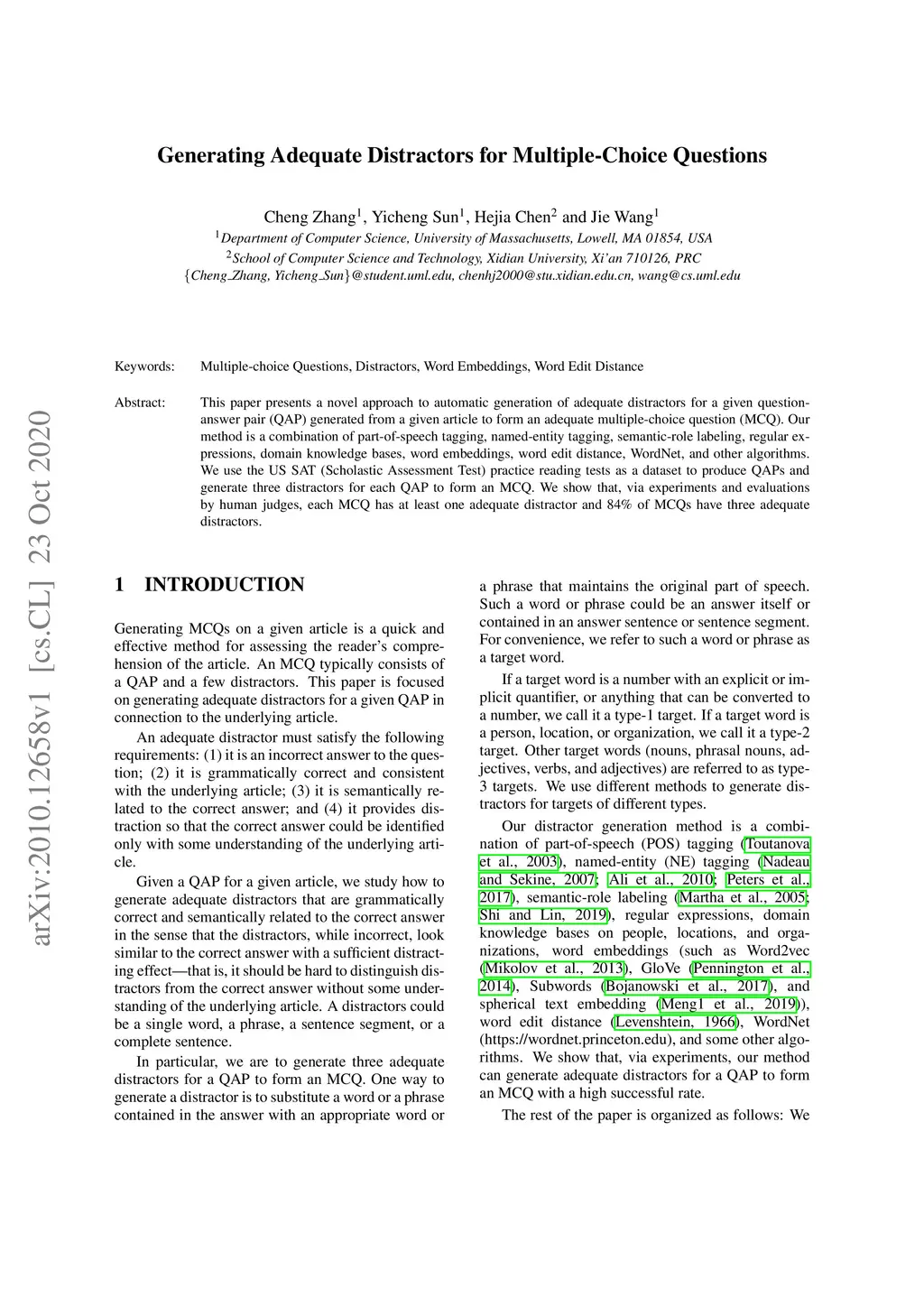 This paper presents a novel approach to automatic generation of adequate distractors for a given question-answer pair (QAP) generated from a given article to form an adequate multiple-choice question (MCQ). Our method is a combination of part-of-speech tagging, named-entity tagging, semantic-role labeling, regular expressions, domain knowledge bases, word embeddings, word edit distance, WordNet, and other algorithms. We use the US SAT (Scholastic Assessment Test) practice reading tests as a dataset to produce QAPs and generate three distractors for each QAP to form an MCQ. We show that, via experiments and evaluations by human judges, each MCQ has at least one adequate distractor and 84\% of MCQs have three adequate distractors.