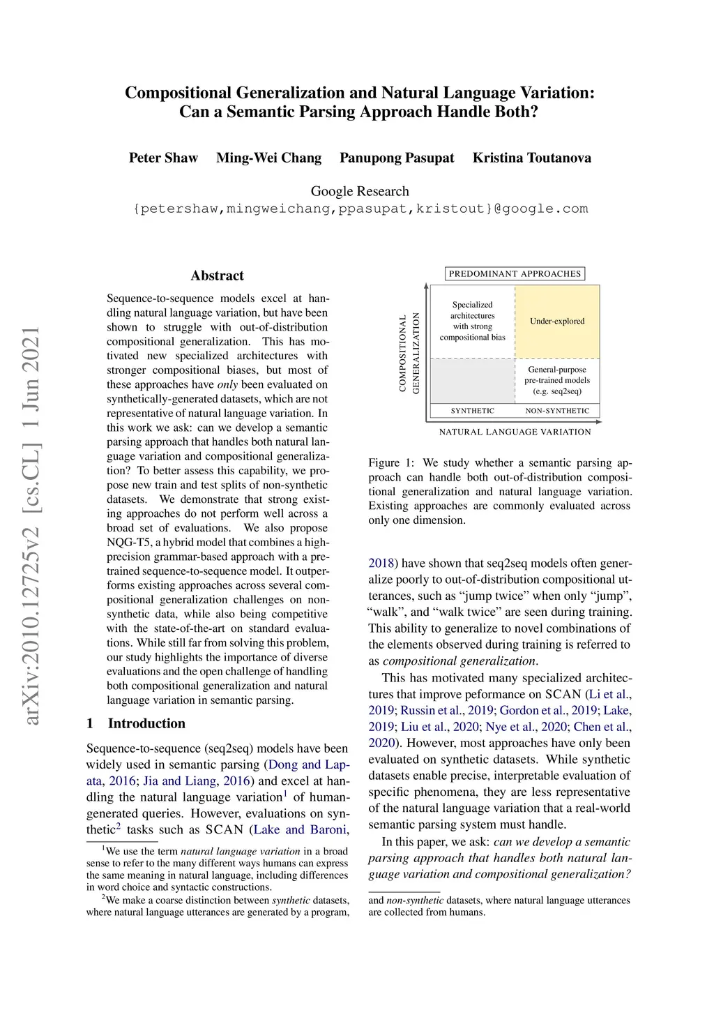 Sequence-to-sequence models excel at handling natural language variation, but have been shown to struggle with out-of-distribution compositional generalization. This has motivated new specialized architectures with stronger compositional biases, but most of these approaches have only been evaluated on synthetically-generated datasets, which are not representative of natural language variation. In this work we ask: can we develop a semantic parsing approach that handles both natural language variation and compositional generalization? To better assess this capability, we propose new train and test splits of non-synthetic datasets. We demonstrate that strong existing approaches do not perform well across a broad set of evaluations. We also propose NQG-T5, a hybrid model that combines a high-precision grammar-based approach with a pre-trained sequence-to-sequence model. It outperforms existing approaches across several compositional generalization challenges on non-synthetic data, while also being competitive with the state-of-the-art on standard evaluations. While still far from solving this problem, our study highlights the importance of diverse evaluations and the open challenge of handling both compositional generalization and natural language variation in semantic parsing.