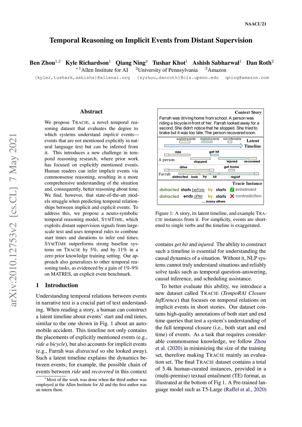We propose TRACIE, a novel temporal reasoning dataset that evaluates the degree to which systems understand implicit events -- events that are not mentioned explicitly in natural language text but can be inferred from it. This introduces a new challenge in temporal reasoning research, where prior work has focused on explicitly mentioned events. Human readers can infer implicit events via commonsense reasoning, resulting in a more comprehensive understanding of the situation and, consequently, better reasoning about time. We find, however, that state-of-the-art models struggle when predicting temporal relationships between implicit and explicit events. To address this, we propose a neuro-symbolic temporal reasoning model, SYMTIME, which exploits distant supervision signals from large-scale text and uses temporal rules to combine start times and durations to infer end times. SYMTIME outperforms strong baseline systems on TRACIE by 5%, and by 11% in a zero prior knowledge training setting. Our approach also generalizes to other temporal reasoning tasks, as evidenced by a gain of 1%-9% on MATRES, an explicit event benchmark.
