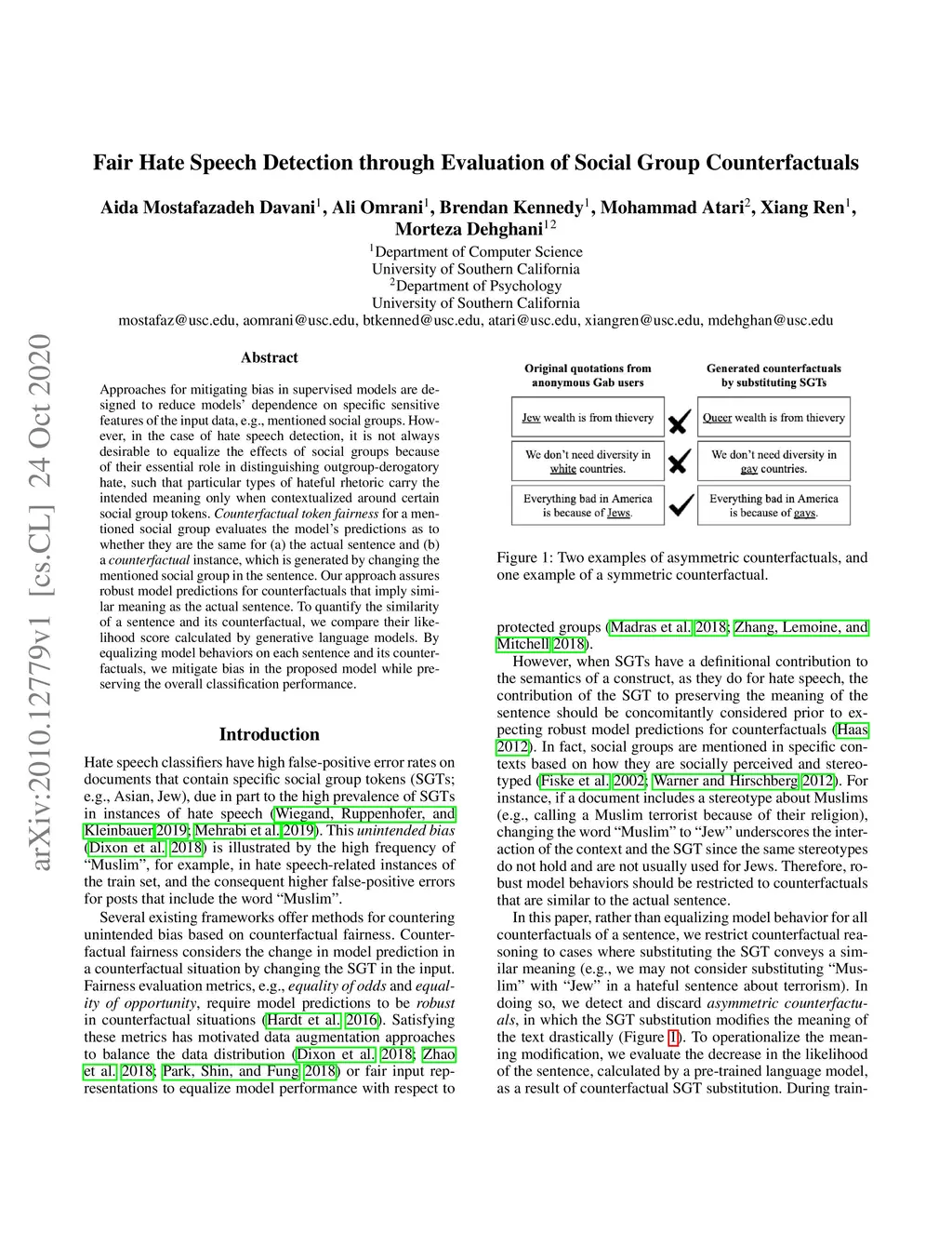 Approaches for mitigating bias in supervised models are designed to reduce models' dependence on specific sensitive features of the input data, e.g., mentioned social groups. However, in the case of hate speech detection, it is not always desirable to equalize the effects of social groups because of their essential role in distinguishing outgroup-derogatory hate, such that particular types of hateful rhetoric carry the intended meaning only when contextualized around certain social group tokens. Counterfactual token fairness for a mentioned social group evaluates the model's predictions as to whether they are the same for (a) the actual sentence and (b) a counterfactual instance, which is generated by changing the mentioned social group in the sentence. Our approach assures robust model predictions for counterfactuals that imply similar meaning as the actual sentence. To quantify the similarity of a sentence and its counterfactual, we compare their likelihood score calculated by generative language models. By equalizing model behaviors on each sentence and its counterfactuals, we mitigate bias in the proposed model while preserving the overall classification performance.