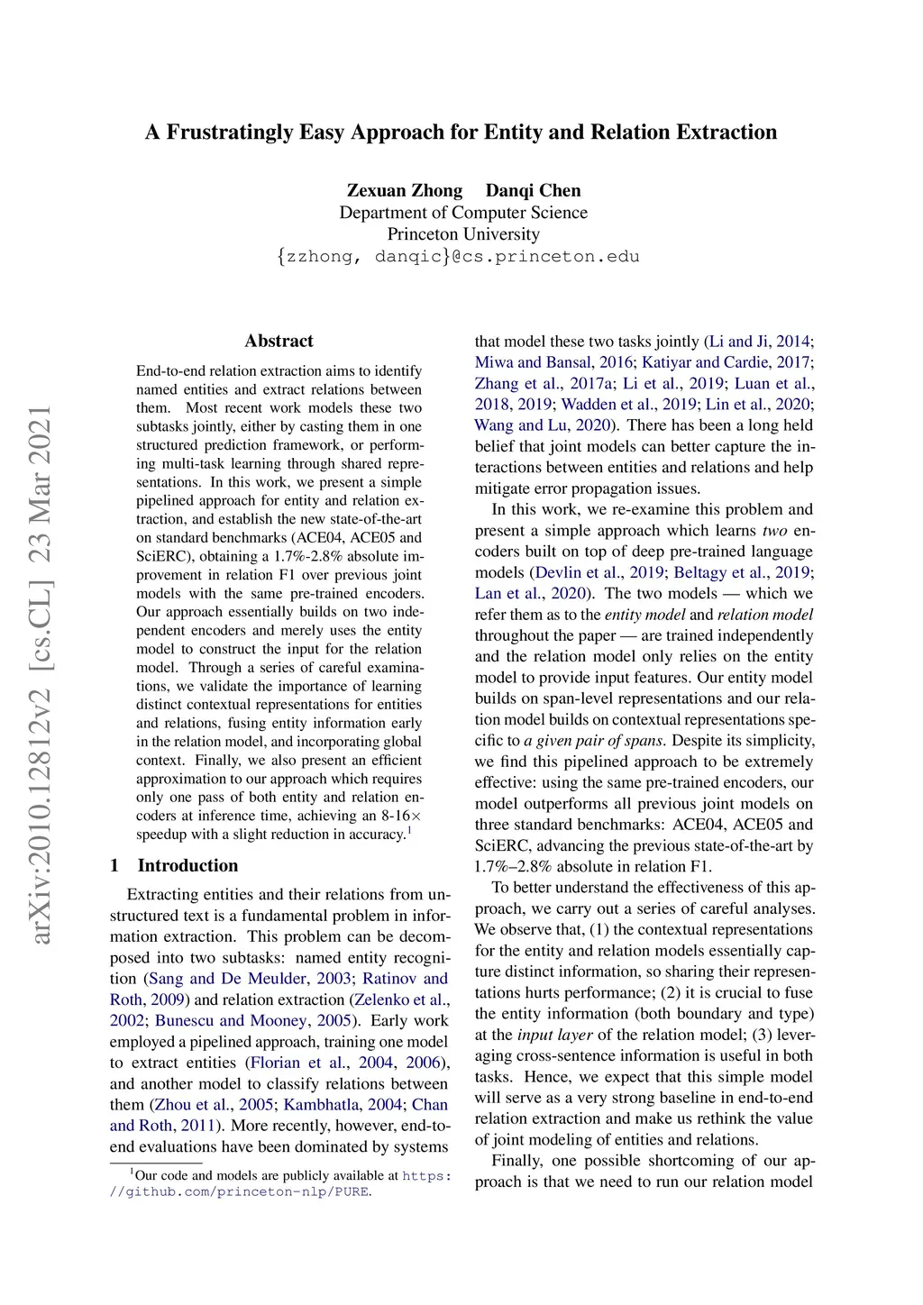 End-to-end relation extraction aims to identify named entities and extract relations between them. Most recent work models these two subtasks jointly, either by casting them in one structured prediction framework, or performing multi-task learning through shared representations. In this work, we present a simple pipelined approach for entity and relation extraction, and establish the new state-of-the-art on standard benchmarks (ACE04, ACE05 and SciERC), obtaining a 1.7%-2.8% absolute improvement in relation F1 over previous joint models with the same pre-trained encoders. Our approach essentially builds on two independent encoders and merely uses the entity model to construct the input for the relation model. Through a series of careful examinations, we validate the importance of learning distinct contextual representations for entities and relations, fusing entity information early in the relation model, and incorporating global context. Finally, we also present an efficient approximation to our approach which requires only one pass of both entity and relation encoders at inference time, achieving an 8-16 speedup with a slight reduction in accuracy.