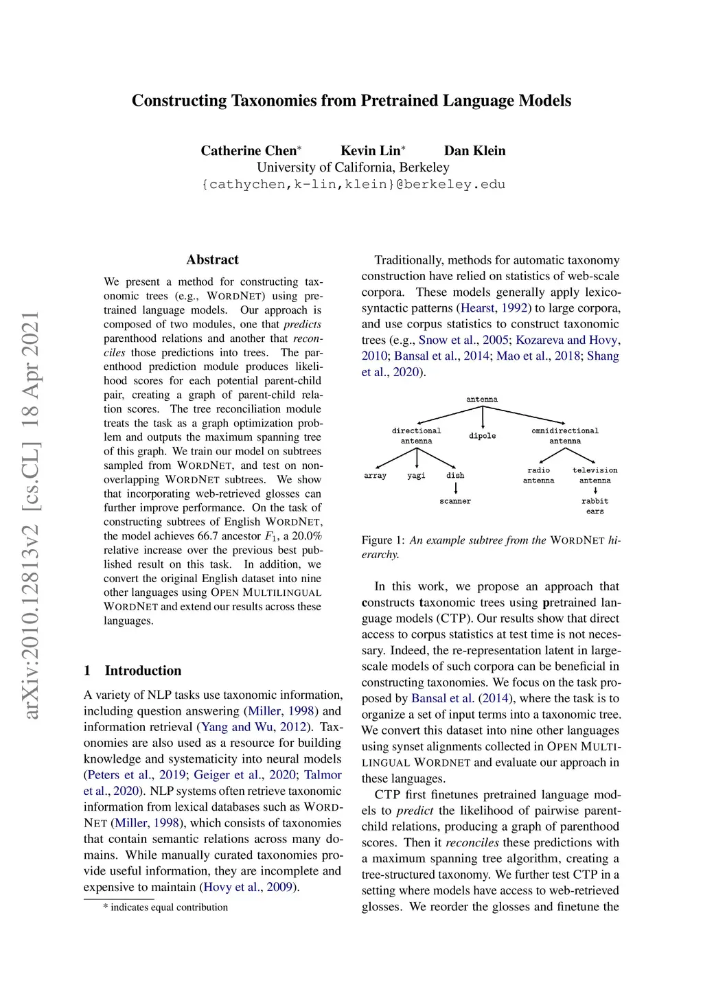 We present a method for constructing taxonomic trees (e.g., WordNet) using pretrained language models. Our approach is composed of two modules, one that predicts parenthood relations and another that reconciles those predictions into trees. The parenthood prediction module produces likelihood scores for each potential parent-child pair, creating a graph of parent-child relation scores. The tree reconciliation module treats the task as a graph optimization problem and outputs the maximum spanning tree of this graph. We train our model on subtrees sampled from WordNet, and test on non-overlapping WordNet subtrees. We show that incorporating web-retrieved glosses can further improve performance. On the task of constructing subtrees of English WordNet, the model achieves 66.7 ancestor F1, a 20.0% relative increase over the previous best published result on this task. In addition, we convert the original English dataset into nine other languages using Open Multilingual WordNet and extend our results across these languages.