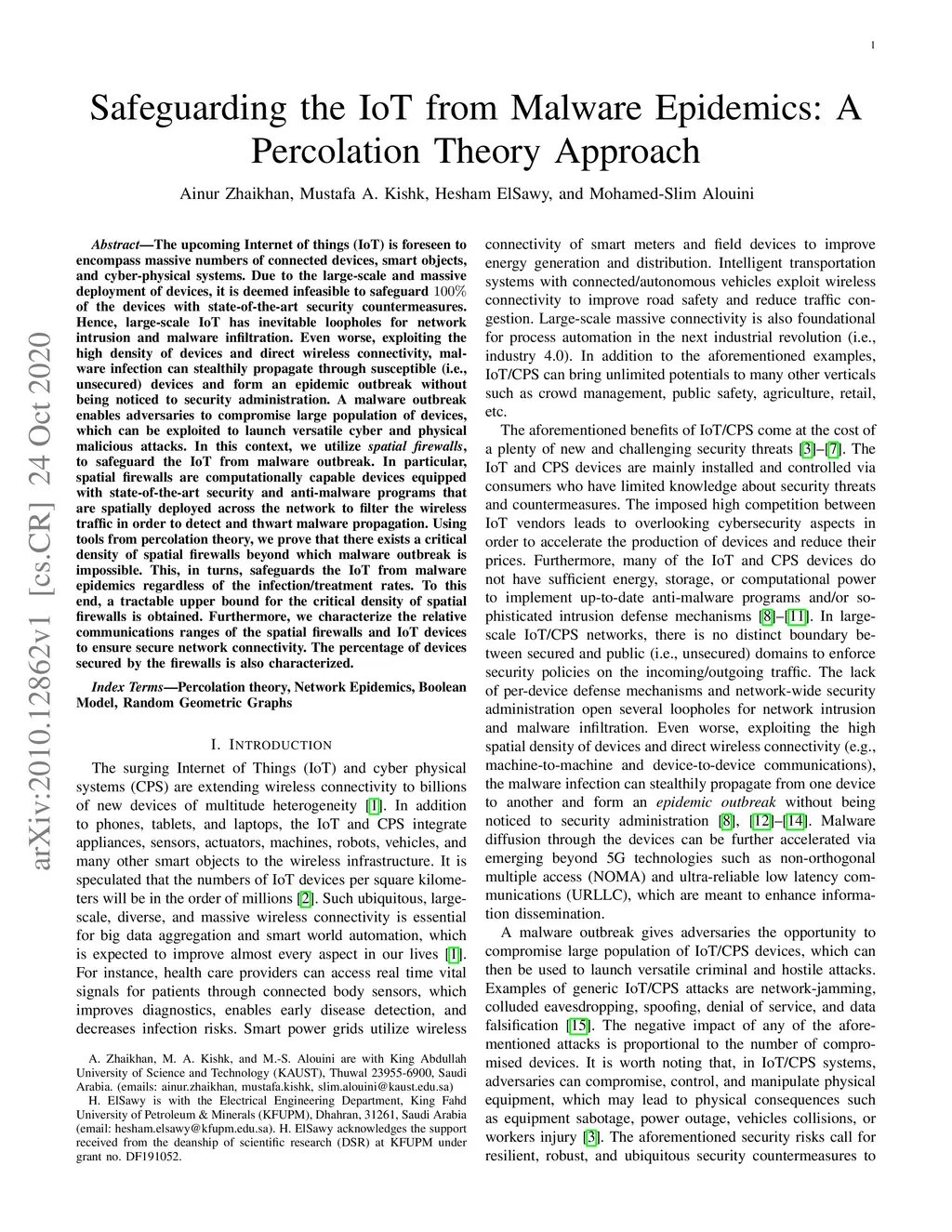 The upcoming Internet of things (IoT) is foreseen to encompass massive numbers of connected devices, smart objects, and cyber-physical systems. Due to the large-scale and massive deployment of devices, it is deemed infeasible to safeguard 100% of the devices with state-of-the-art security countermeasures. Hence, large-scale IoT has inevitable loopholes for network intrusion and malware infiltration. Even worse, exploiting the high density of devices and direct wireless connectivity, malware infection can stealthily propagate through susceptible (i.e., unsecured) devices and form an epidemic outbreak without being noticed to security administration. A malware outbreak enables adversaries to compromise large population of devices, which can be exploited to launch versatile cyber and physical malicious attacks. In this context, we utilize spatial firewalls, to safeguard the IoT from malware outbreak. In particular, spatial firewalls are computationally capable devices equipped with state-of-the-art security and anti-malware programs that are spatially deployed across the network to filter the wireless traffic in order to detect and thwart malware propagation. Using tools from percolation theory, we prove that there exists a critical density of spatial firewalls beyond which malware outbreak is impossible. This, in turns, safeguards the IoT from malware epidemics regardless of the infection/treatment rates. To this end, a tractable upper bound for the critical density of spatial firewalls is obtained. Furthermore, we characterize the relative communications ranges of the spatial firewalls and IoT devices to ensure secure network connectivity. The percentage of devices secured by the firewalls is also characterized.