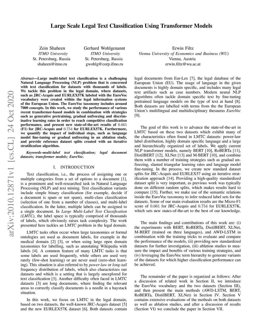 Large multi-label text classification is a challenging Natural Language Processing (NLP) problem that is concerned with text classification for datasets with thousands of labels. We tackle this problem in the legal domain, where datasets, such as JRC-Acquis and EURLEX57K labeled with the EuroVoc vocabulary were created within the legal information systems of the European Union. The EuroVoc taxonomy includes around 7000 concepts. In this work, we study the performance of various recent transformer-based models in combination with strategies such as generative pretraining, gradual unfreezing and discriminative learning rates in order to reach competitive classification performance, and present new state-of-the-art results of 0.661 (F1) for JRC-Acquis and 0.754 for EURLEX57K. Furthermore, we quantify the impact of individual steps, such as language model fine-tuning or gradual unfreezing in an ablation study, and provide reference dataset splits created with an iterative stratification algorithm.