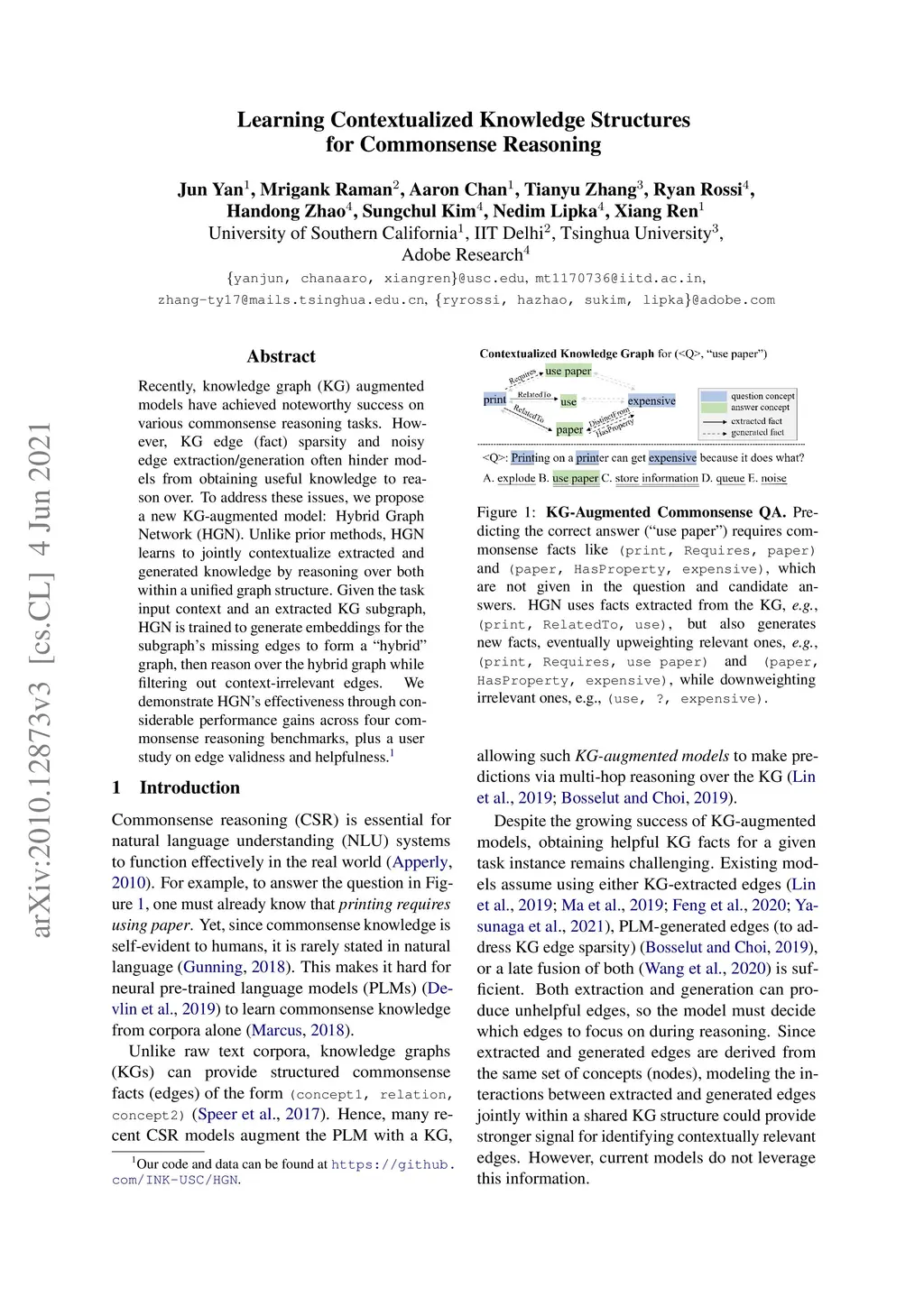 Recently, knowledge graph (KG) augmented models have achieved noteworthy success on various commonsense reasoning tasks. However, KG edge (fact) sparsity and noisy edge extraction/generation often hinder models from obtaining useful knowledge to reason over. To address these issues, we propose a new KG-augmented model: Hybrid Graph Network (HGN). Unlike prior methods, HGN learns to jointly contextualize extracted and generated knowledge by reasoning over both within a unified graph structure. Given the task input context and an extracted KG subgraph, HGN is trained to generate embeddings for the subgraph's missing edges to form a "hybrid" graph, then reason over the hybrid graph while filtering out context-irrelevant edges. We demonstrate HGN's effectiveness through considerable performance gains across four commonsense reasoning benchmarks, plus a user study on edge validness and helpfulness.