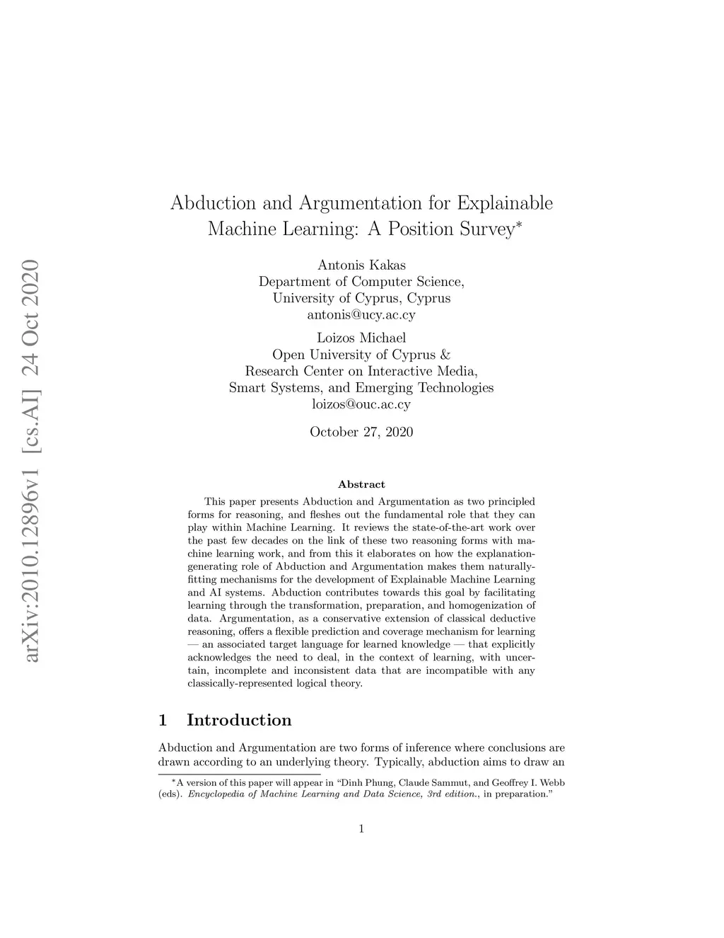 This paper presents Abduction and Argumentation as two principled forms for reasoning, and fleshes out the fundamental role that they can play within Machine Learning. It reviews the state-of-the-art work over the past few decades on the link of these two reasoning forms with machine learning work, and from this it elaborates on how the explanation-generating role of Abduction and Argumentation makes them naturally-fitting mechanisms for the development of Explainable Machine Learning and AI systems. Abduction contributes towards this goal by facilitating learning through the transformation, preparation, and homogenization of data. Argumentation, as a conservative extension of classical deductive reasoning, offers a flexible prediction and coverage mechanism for learning -- an associated target language for learned knowledge -- that explicitly acknowledges the need to deal, in the context of learning, with uncertain, incomplete and inconsistent data that are incompatible with any classically-represented logical theory.