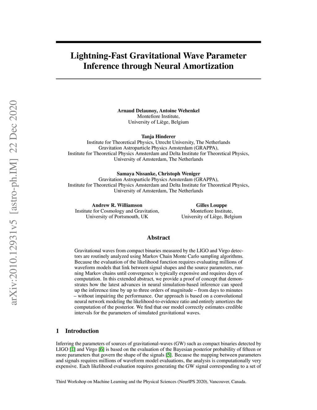 Gravitational waves from compact binaries measured by the LIGO and Virgo detectors are routinely analyzed using Markov Chain Monte Carlo sampling algorithms. Because the evaluation of the likelihood function requires evaluating millions of waveform models that link between signal shapes and the source parameters, running Markov chains until convergence is typically expensive and requires days of computation. In this extended abstract, we provide a proof of concept that demonstrates how the latest advances in neural simulation-based inference can speed up the inference time by up to three orders of magnitude -- from days to minutes -- without impairing the performance. Our approach is based on a convolutional neural network modeling the likelihood-to-evidence ratio and entirely amortizes the computation of the posterior. We find that our model correctly estimates credible intervals for the parameters of simulated gravitational waves.