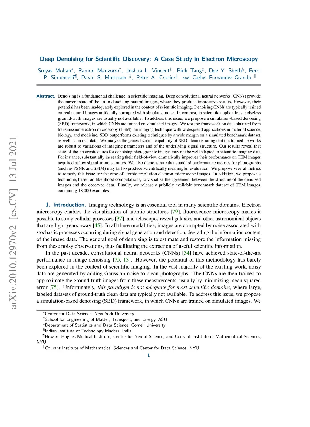 Denoising is a fundamental challenge in scientific imaging. Deep convolutional neural networks (CNNs) provide the current state of the art in denoising natural images, where they produce impressive results. However, their potential has barely been explored in the context of scientific imaging. Denoising CNNs are typically trained on real natural images artificially corrupted with simulated noise. In contrast, in scientific applications, noiseless ground-truth images are usually not available. To address this issue, we propose a simulation-based denoising (SBD) framework, in which CNNs are trained on simulated images. We test the framework on data obtained from transmission electron microscopy (TEM), an imaging technique with widespread applications in material science, biology, and medicine. SBD outperforms existing techniques by a wide margin on a simulated benchmark dataset, as well as on real data. Apart from the denoised images, SBD generates likelihood maps to visualize the agreement between the structure of the denoised image and the observed data. Our results reveal shortcomings of state-of-the-art denoising architectures, such as their small field-of-view: substantially increasing the field-of-view of the CNNs allows them to exploit non-local periodic patterns in the data, which is crucial at high noise levels. In addition, we analyze the generalization capability of SBD, demonstrating that the trained networks are robust to variations of imaging parameters and of the underlying signal structure. Finally, we release the first publicly available benchmark dataset of TEM images, containing 18,000 examples.