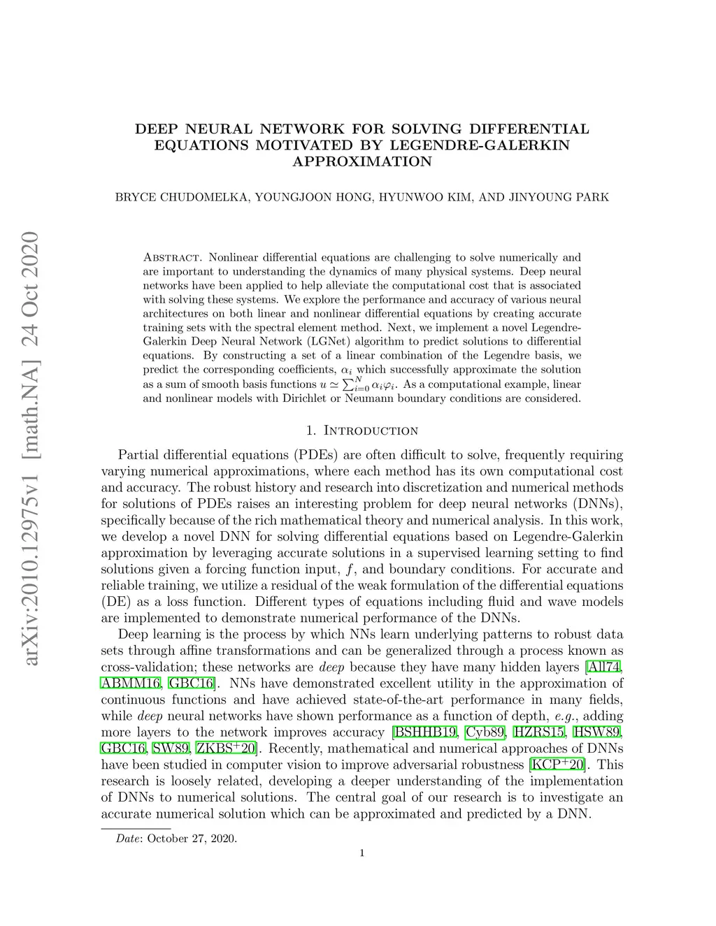 Nonlinear differential equations are challenging to solve numerically and are important to understanding the dynamics of many physical systems. Deep neural networks have been applied to help alleviate the computational cost that is associated with solving these systems. We explore the performance and accuracy of various neural architectures on both linear and nonlinear differential equations by creating accurate training sets with the spectral element method. Next, we implement a novel Legendre-Galerkin Deep Neural Network (LGNet) algorithm to predict solutions to differential equations. By constructing a set of a linear combination of the Legendre basis, we predict the corresponding coefficients, which successfully approximate the solution as a sum of smooth basis functions . As a computational example, linear and nonlinear models with Dirichlet or Neumann boundary conditions are considered.