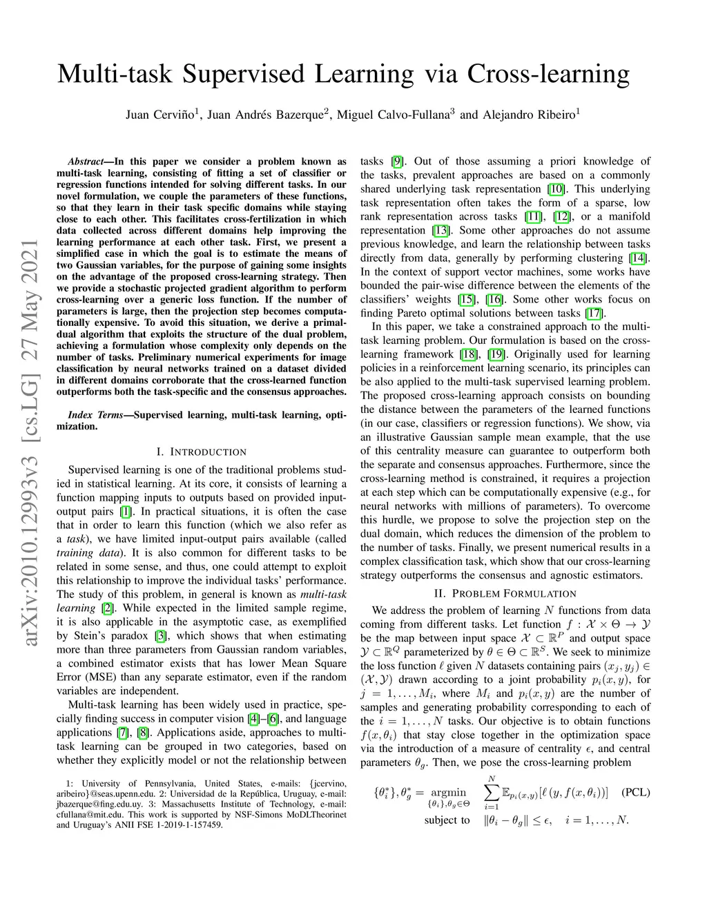 In this paper we consider a problem known as multi-task learning, consisting of fitting a set of classifier or regression functions intended for solving different tasks. In our novel formulation, we couple the parameters of these functions, so that they learn in their task specific domains while staying close to each other. This facilitates cross-fertilization in which data collected across different domains help improving the learning performance at each other task. First, we present a simplified case in which the goal is to estimate the means of two Gaussian variables, for the purpose of gaining some insights on the advantage of the proposed cross-learning strategy. Then we provide a stochastic projected gradient algorithm to perform cross-learning over a generic loss function. If the number of parameters is large, then the projection step becomes computationally expensive. To avoid this situation, we derive a primal-dual algorithm that exploits the structure of the dual problem, achieving a formulation whose complexity only depends on the number of tasks. Preliminary numerical experiments for image classification by neural networks trained on a dataset divided in different domains corroborate that the cross-learned function outperforms both the task-specific and the consensus approaches.