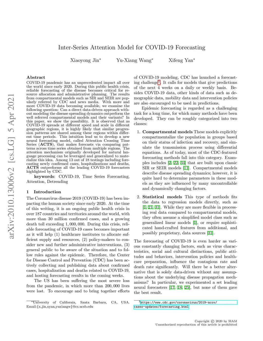 COVID-19 pandemic has an unprecedented impact all over the world since early 2020. During this public health crisis, reliable forecasting of the disease becomes critical for resource allocation and administrative planning. The results from compartmental models such as SIR and SEIR are popularly referred by CDC and news media. With more and more COVID-19 data becoming available, we examine the following question: Can a direct data-driven approach without modeling the disease spreading dynamics outperform the well referred compartmental models and their variants? In this paper, we show the possibility. It is observed that as COVID-19 spreads at different speed and scale in different geographic regions, it is highly likely that similar progression patterns are shared among these regions within different time periods. This intuition lead us to develop a new neural forecasting model, called Attention Crossing Time Series (\textbf{ACTS}), that makes forecasts via comparing patterns across time series obtained from multiple regions. The attention mechanism originally developed for natural language processing can be leveraged and generalized to materialize this idea. Among 13 out of 18 testings including forecasting newly confirmed cases, hospitalizations and deaths, \textbf{ACTS} outperforms all the leading COVID-19 forecasters highlighted by CDC.